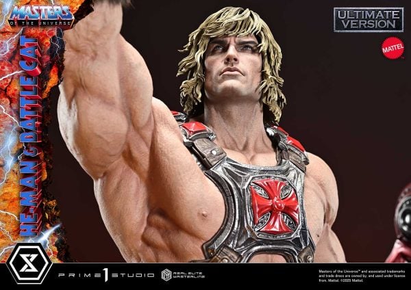 His wild hair and striking portrait, along with the finely honed body that embodies “the Most Powerful Man in the Universe,” blend realistic detail with subtle stylization. The massive Power Sword, his battle harness, and the shoulder armor and loincloth accented with fur are all crafted with rich, tactile surfaces.