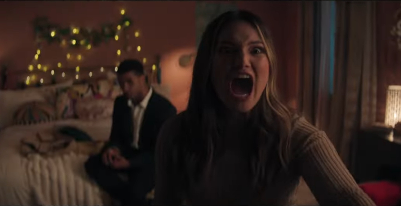 It’s a strong opening that makes way for a meet cute, followed by spending an unforgivable amount of time getting to know clichéd romantic comedy archetypes. Olivia Holt’s (familiar acting in slashers, having recently appeared in Totally Killer) Ally is an advertiser for a jewelry company who has based her latest marketing campaign around doomed romances centered on death. It turns out this is the worst possible timing for that as the Heart Eyes Killer (who has previously terrorized Boston, among other cities) has taken his machete and crossbow to Seattle for the next round of brutality. Newly employed Jay (Mason Gooding, also with prior slasher experience having been in some of the recent Scream installments) is instructed to work with Ally on retooling the marketing and hoping that they are forgiven by some angry commenters (which the film uses to playfully and briefly poke fun at outrage culture.)