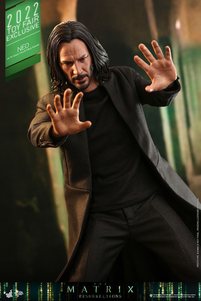 Faithfully crafted based on the appearance of Keanu Reeves as Neo in The Matrix Resurrections, the Neo figure features a newly developed head sculpt and hair sculpture highlighting impressive likeness; the iconic long coat and form-fitting outfit with fine tailoring; an array of highly-detailed accessories including a pair of sunglasses, a bottle of pills, bullets with interchangeable waves effect, two-sided backdrop with mirror and frame, a Matrix video game themed backdrop with lenticular effect, interchangeable hands with blue pills and red pills, and a Matrix figure stand.