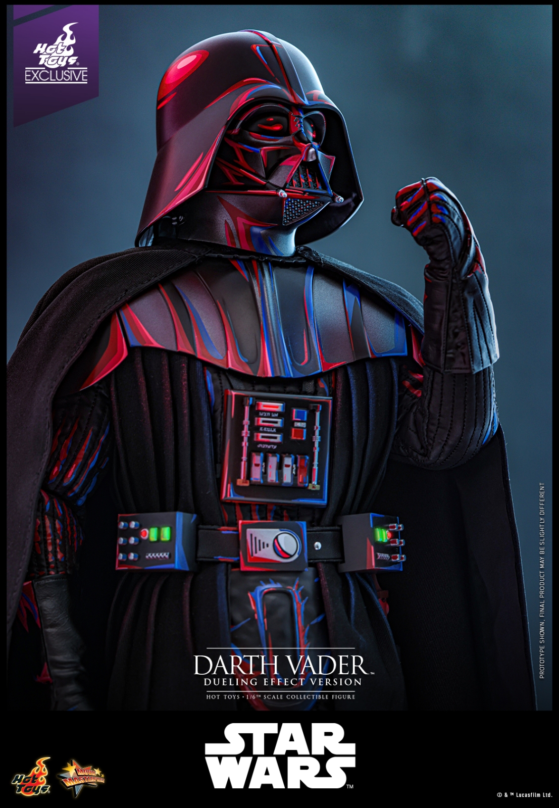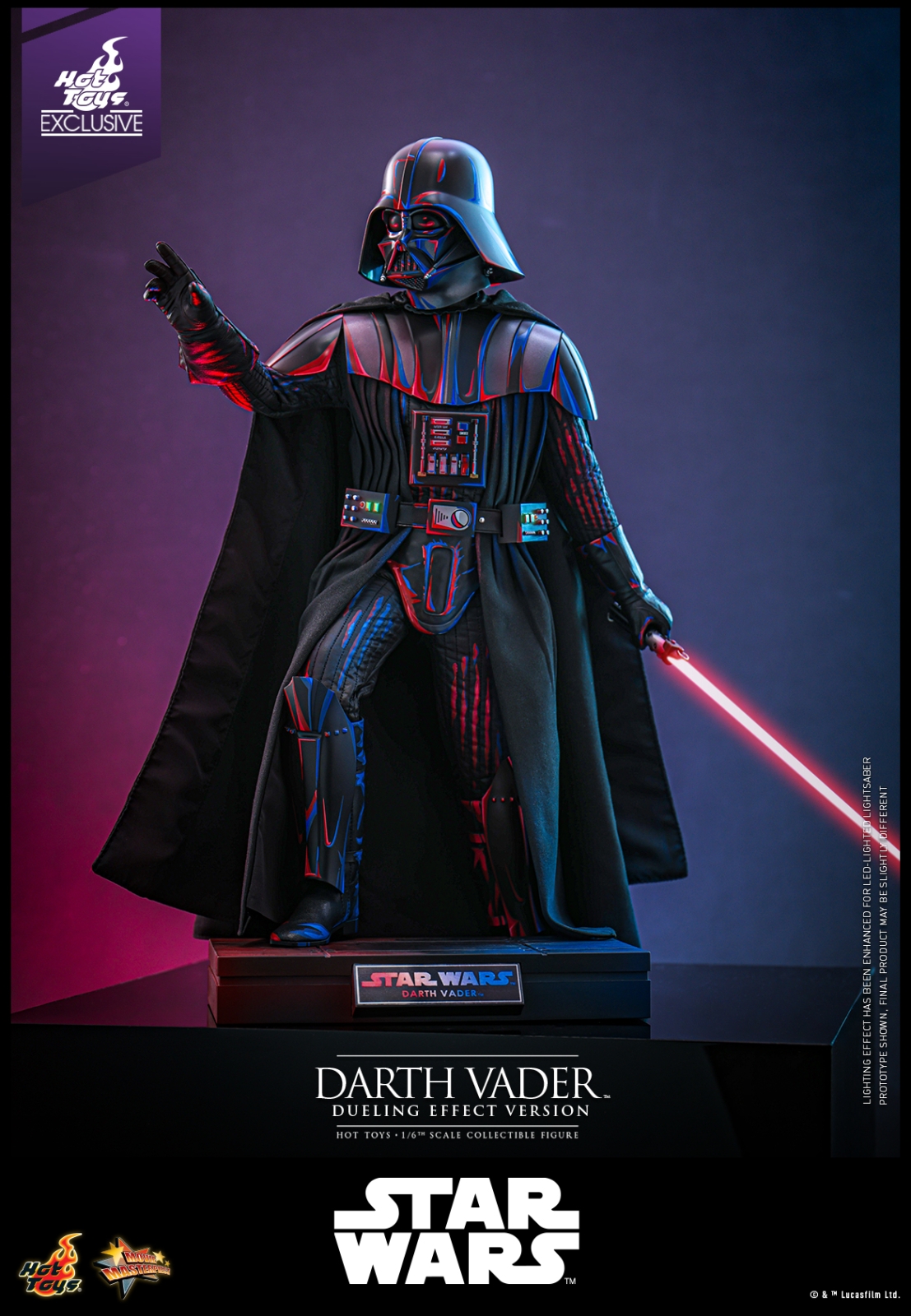 This stunning 1/6th scale Darth Vader ™ (Dueling Effect Version) Collectible Figure showcases a dynamic style with a comic-inspired dueling effect, defined by a vivid red and blue pattern design that highlights the streamlined details of Darth Vader’s black helmet, armor pieces, and everywhere on the costume. The highly-detailed collectible figure features meticulously crafted Darth Vader helmet and armor, skillfully tailored body suit, LED lighted life support device and belt, an LED light-up lightsaber and a specially designed themed figure base.