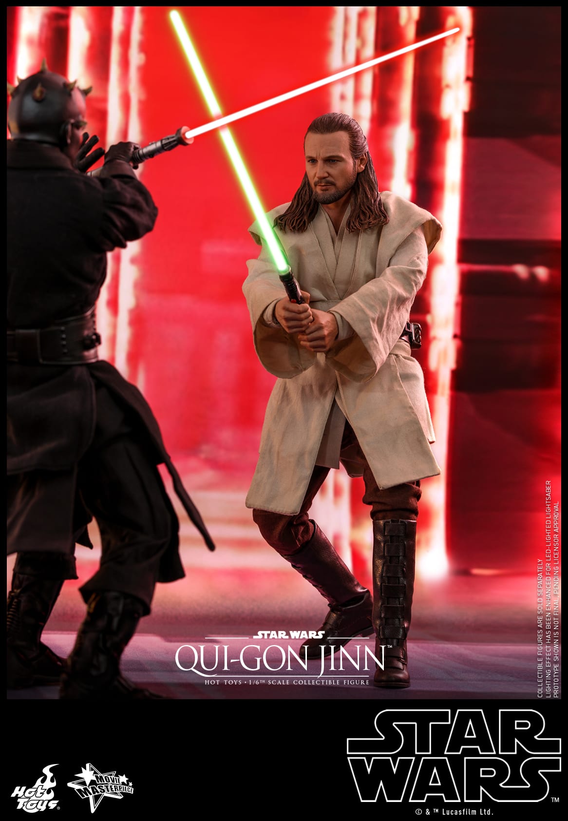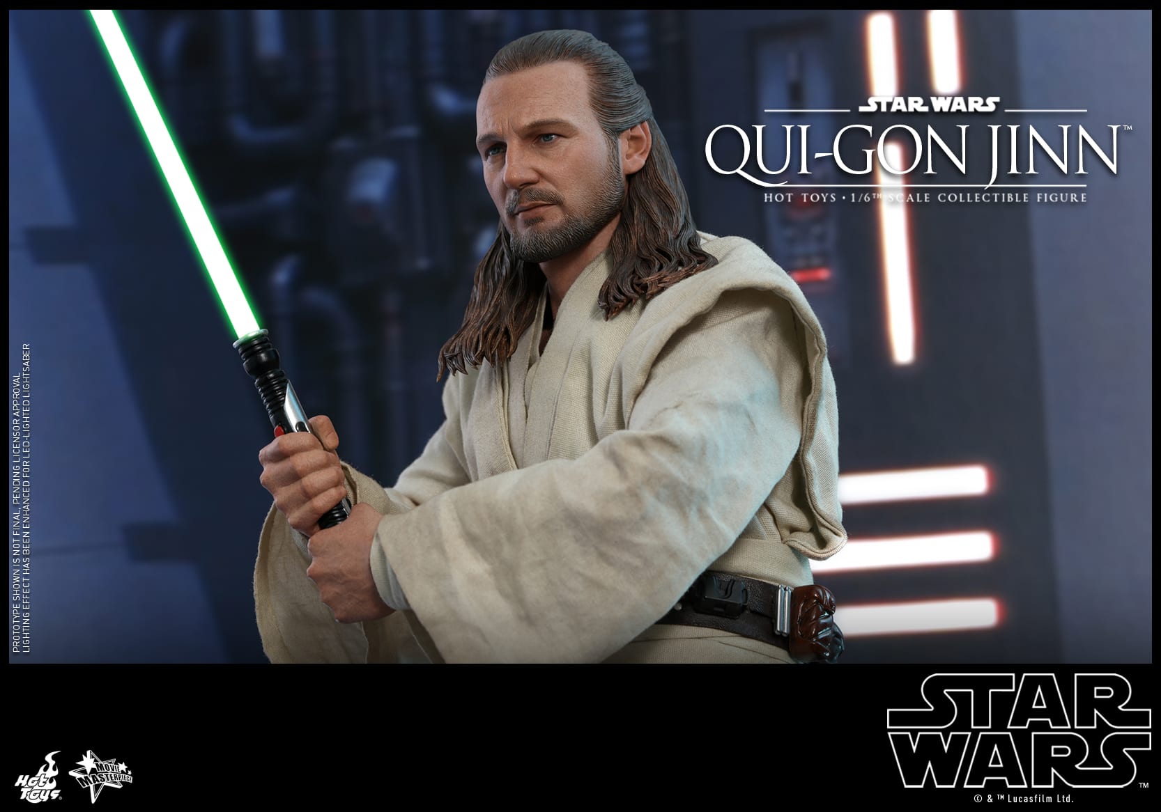 Skillfully crafted based on the appearance of Qui-Gon Jinn in the film, this 1/6th scale collectible figure features a newly developed head sculpt, finely tailored Jedi robe and tunic, a desert poncho, a LED light-up lightsaber, a Comlink, a grappling hook, a hologram projector with interchangeable holograms, and a themed figure base!