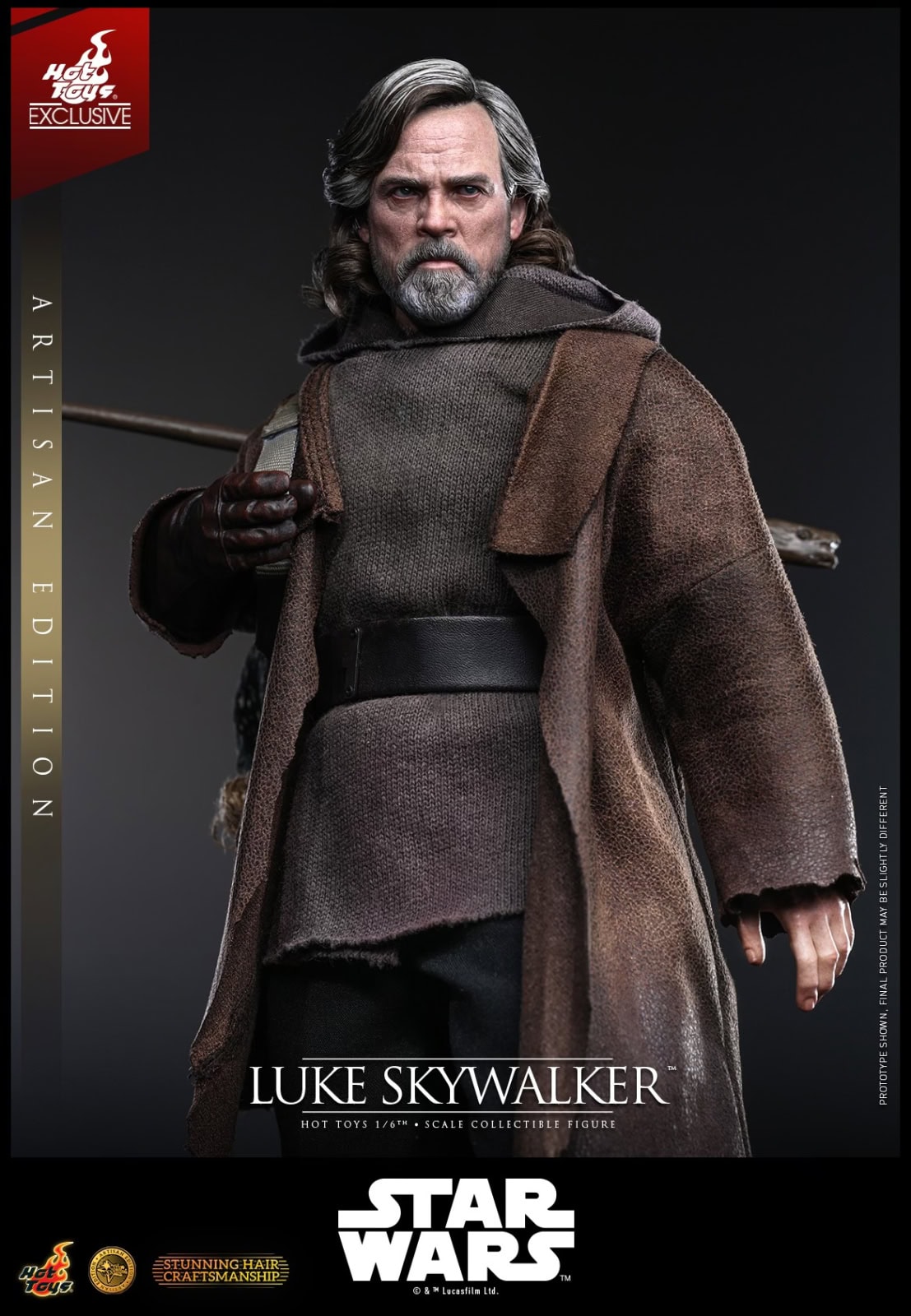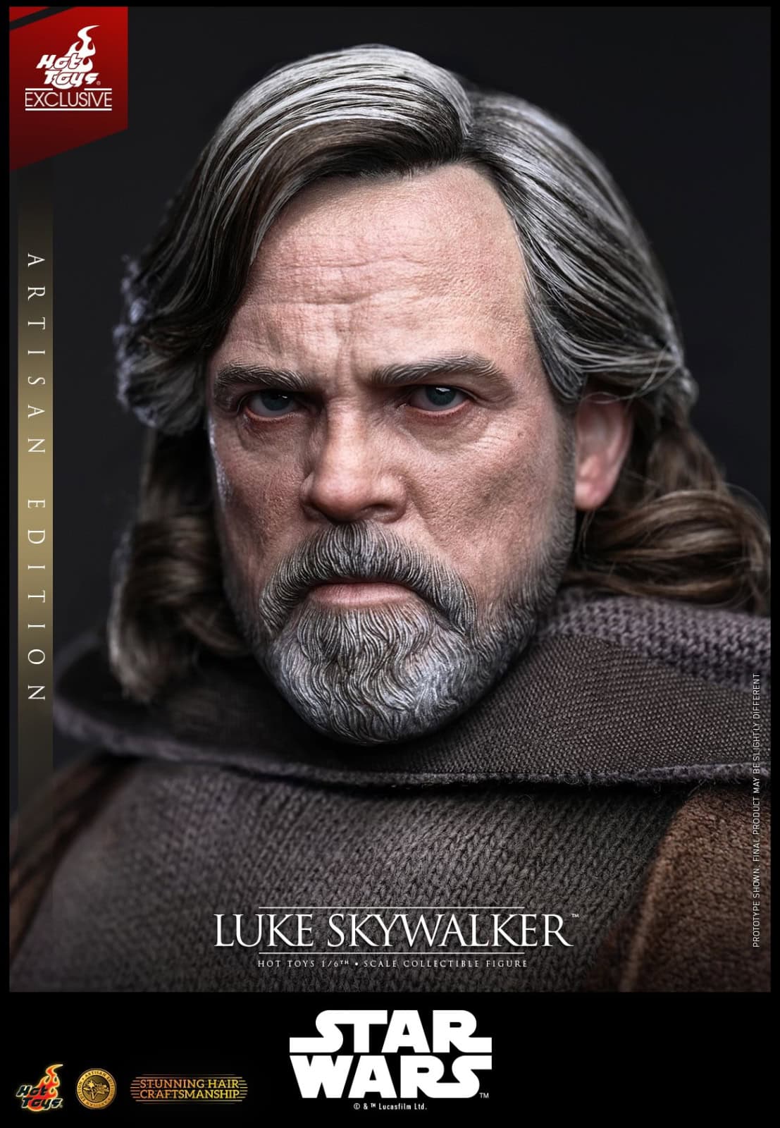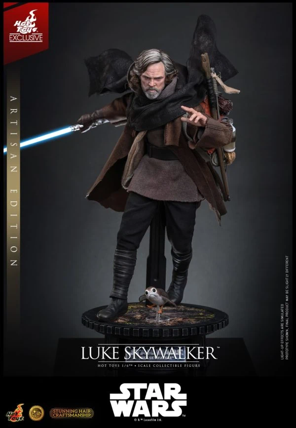 Hot Toys is incredibly proud to introduce the 1/6th scale Luke Skywalker Collectible Figure (Artisan Edition), based on his appearance in Star Wars: The Last Jedi™. The figure features a newly developed head sculpt of Mark Hamill with separate rolling eyeballs, complete with incredibly detailed wrinkles, beard, and skin texture. A highlight of this figure is the meticulously implanted mid-length hairstyle — utilizing premium wool material to recreate his complex blend of gray, white, and faded sandy-blonde hair to achieve lifelike realism. Standing approximately 29 cm tall, Luke is dressed in a masterfully tailored multi-layered outfit designed to reflect his life on the island. The costume features a black poncho, a brown worn jacket, a gray hooded tunic, and a pair of black pants paired with a belt and dark gray boots.
