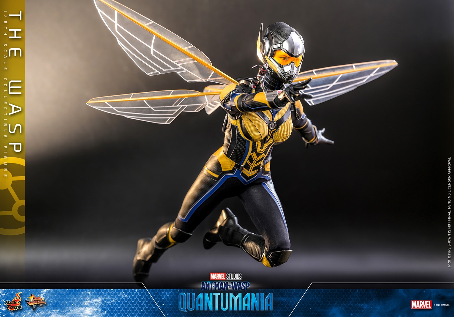 Beautifully crafted based on the screen appearance of Evangeline Lilly as Hope Van Dyne in the film, the amazingly-detailed figure features a newly developed head with separate rolling eyeball function, detailed short hair sculpture, a newly developed helmeted sculpt with LED light-up function that bears a high resemblance of a closed helmet showing part of the Wasp’s face, two styles wings including collapse wings and moveable wings for flying poses, a navy and yellow colored costume, an opened helmet accessory attachable to the back of figure, Ant-Man miniature diorama and a figure stand.