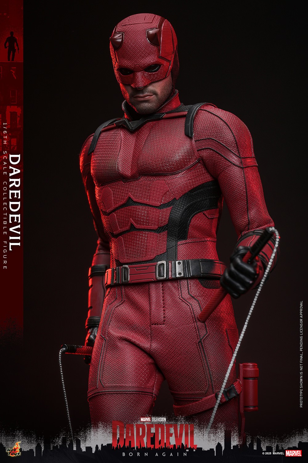Inspired by Charlie Cox’s classic portrayal as Daredevil, the 1/6th scale figure, based on his look in Daredevil: Born Again, features a newly developed Matt Murdock head sculpt, a new cowled head with interchangeable lower faces, a finely tailored Daredevil suit with weathering details to replicate his suit after combats, his iconic Billy Clubs in different styles for alternative display options, a damaged Daredevil cowl with one horn broken, his iconic pair of sunglasses, and a figure stand.