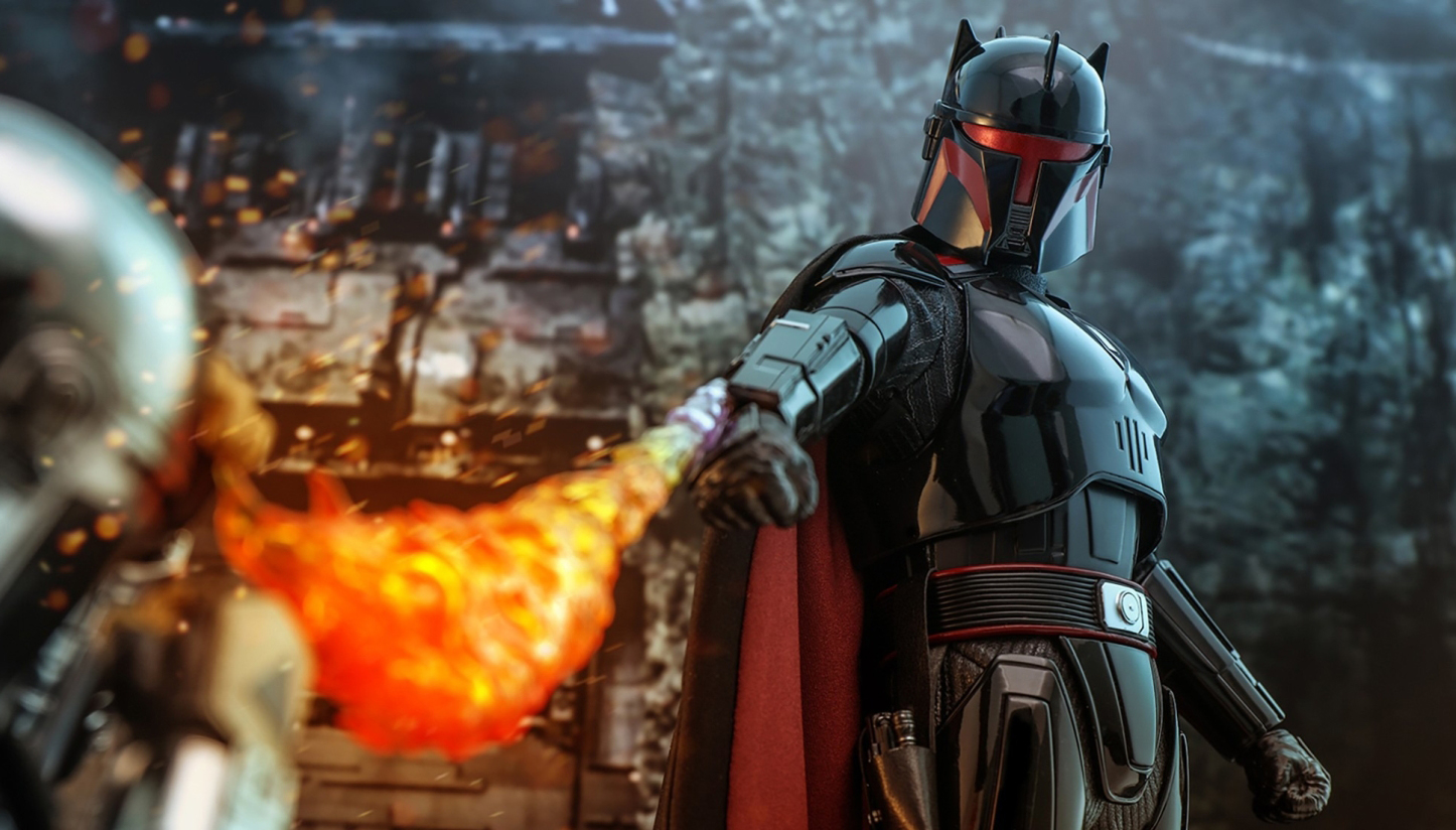 The highly-accurate collectible figure specially features a newly developed head sculpt with incredible likeness and rotatable eyes, detailed beskar helmet, armor and outfit, a jetpack, electrostaff in extended and collapsed mode, a blaster pistol, a whipcord, flamethrower effect accessory, a display base, and a crushed Darksaber hilt!
