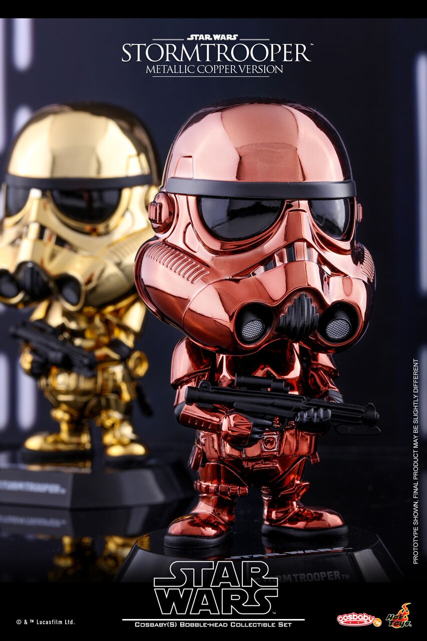 Everyone’s favorite Imperial Stormtroopers are made into stylish Cosbaby Bobble-Head collectibles with sleek and eye-catching metallic gold and metallic copper finish. Each Cosbaby stands approximately 11cm tall with base and has bobble-head function.