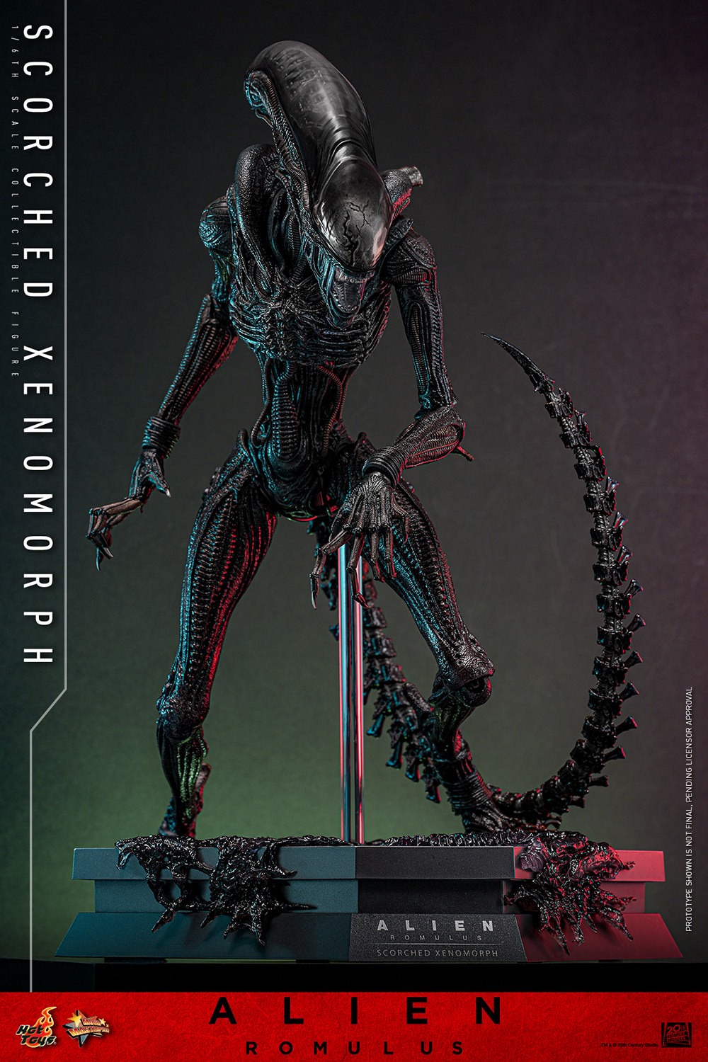 The immense Scorched Xenomorph sixth-scale collectible figure stands at about 44 cm tall and is skillfully painted in black and dark gray with a glossy finish to mimic the organic presentation as a Xenomorph. This highly detailed figure features a body with new joint designs to enhance wide range of articulation, a newly developed head sculpt with an exquisitely crafted internal structures, and comes with two interchangeable translucent carapaces in regular and battle-damage styles to provide different display options. The newly developed extendable inner jaw and bendable tail allow collectors to create dynamic poses. Along with the figure, it comes with an articulated Facehugger and an LED-lighted space station themed diorama figure stand inspired by movie.