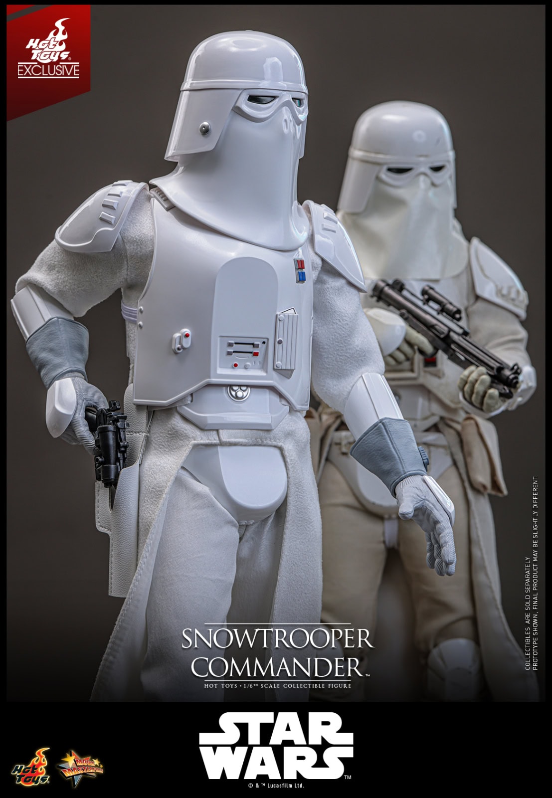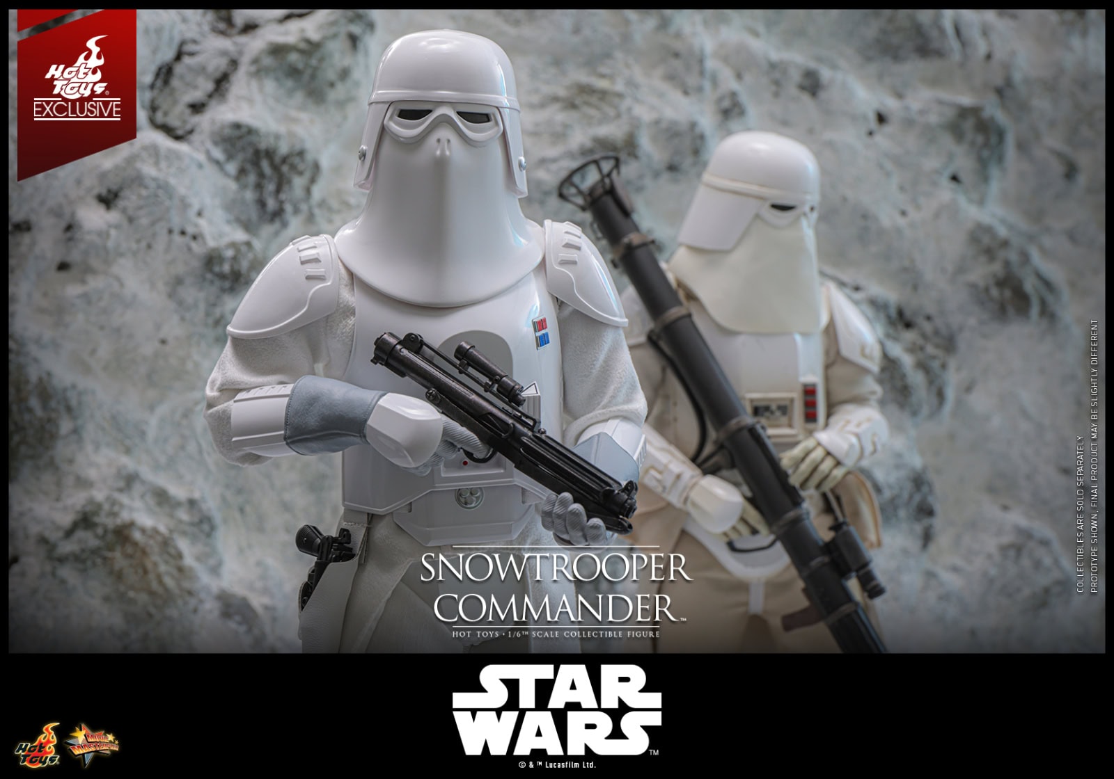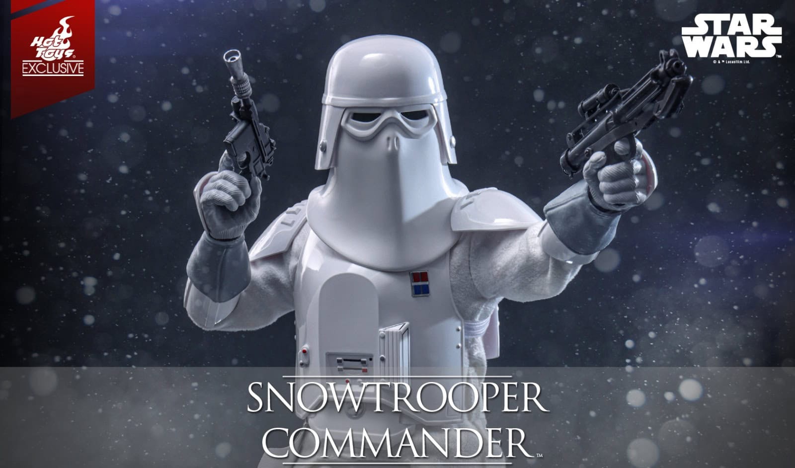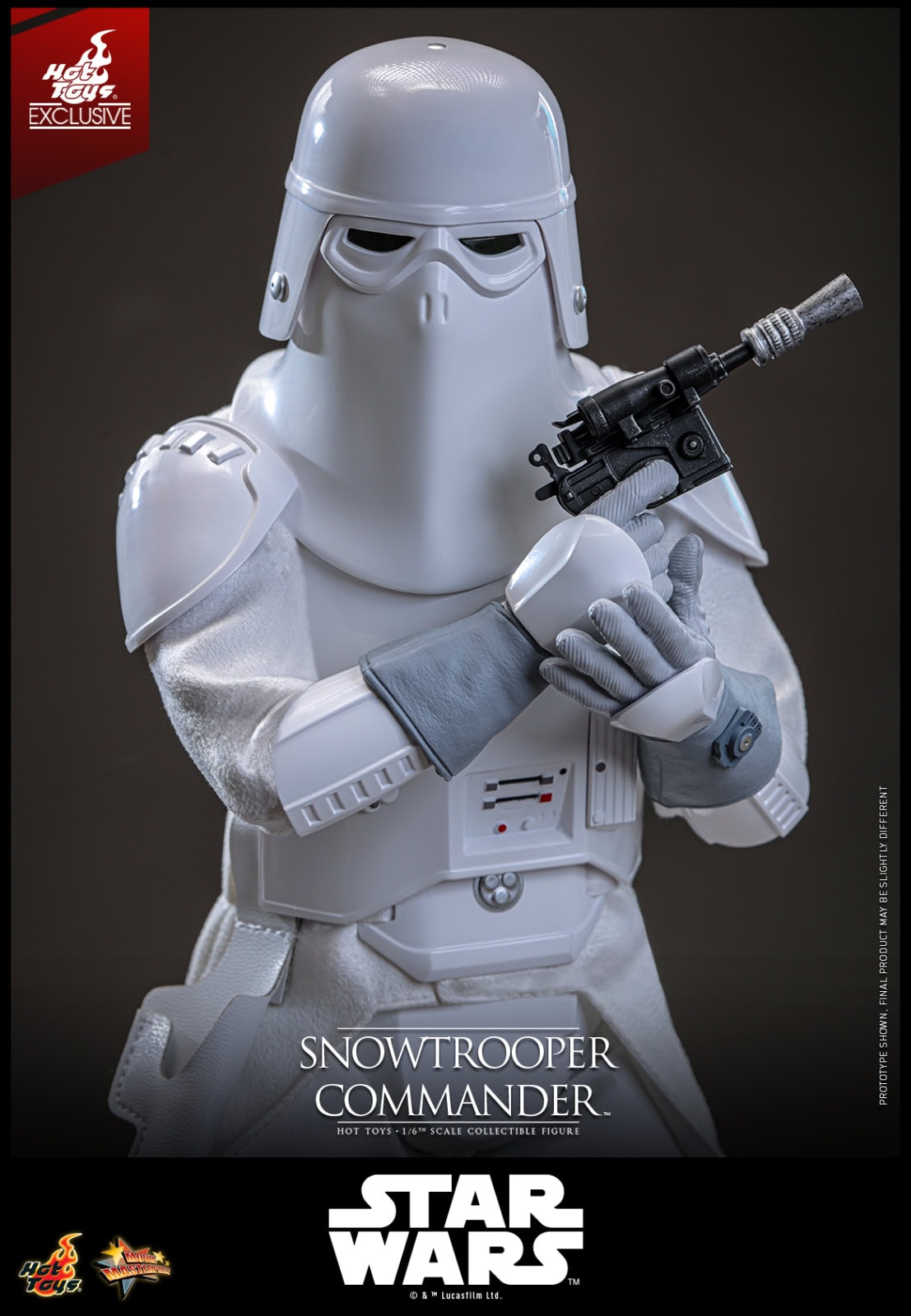 Equipped with an E-11 blaster pistol, DL-44 blaster rifle, and a thermal detonator attachable to the belt, the Snowtrooper Commander is ready for any mission in the harshest conditions. The figure also features eight interchangeable hands, enabling a variety of display poses, ranging from issuing commands to engaging in battle. Completing the display, the commander stands on a specially designed snow-themed figure stand.