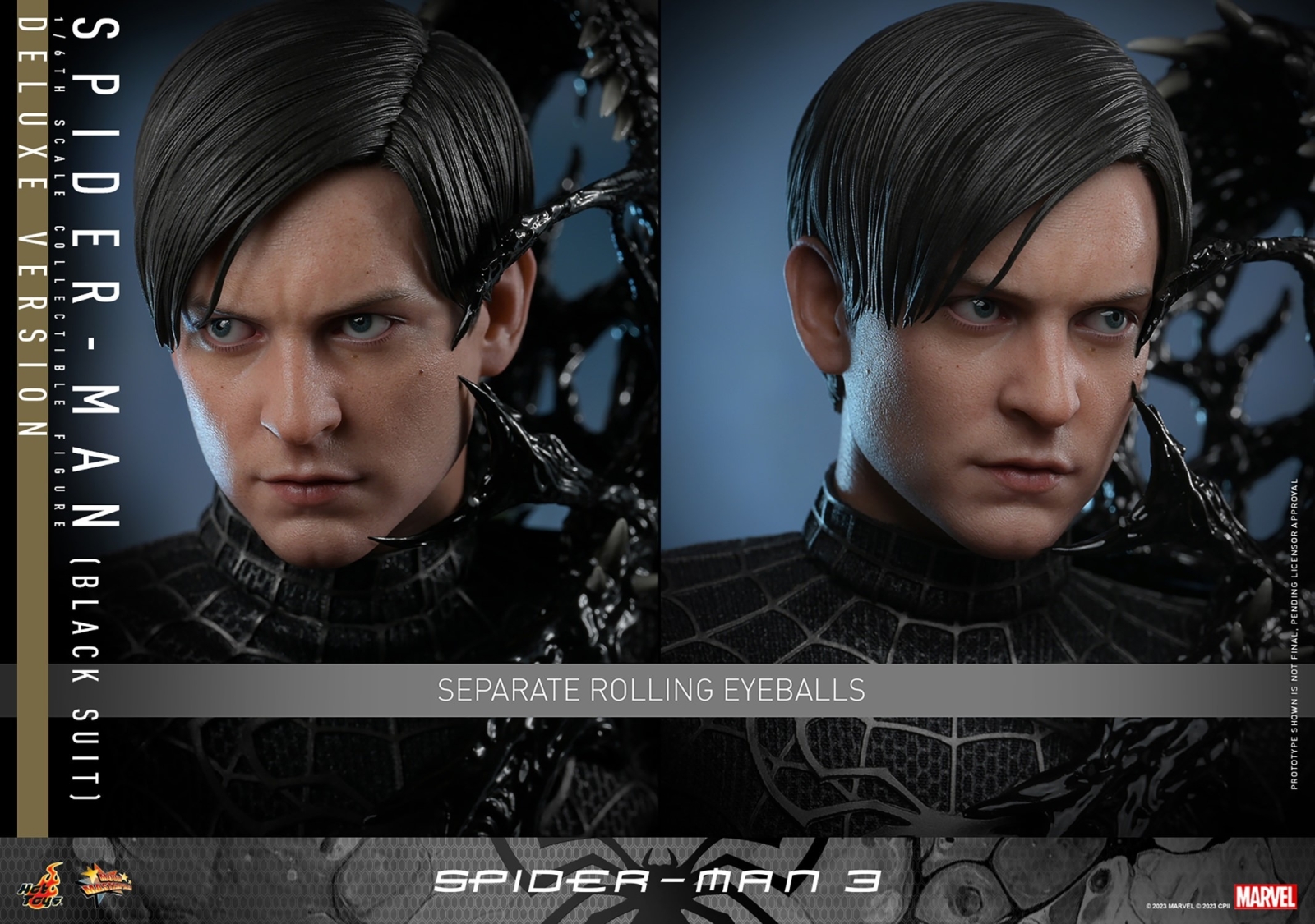 Carefully crafted based on the appearance of Tobey Maguire as Spider-Man / Peter Parker wearing Black Suit from Spider-Man 3, the one-sixth scale figure features a newly developed head sculpt with separate rolling eyeball system, an interchangeable masked head; a greatly-poseable body for dynamic poses; faithful recreation of the black suit with raised silver webbing patterns; accessories such as alien symbiote arms and head with protruding tongue, Spider-Man mask, assorted spider-web webbing accessories, and a themed display base. A Special Edition available in selected markets includes an additional alien symbiote head as bonus item as exclusive display option.