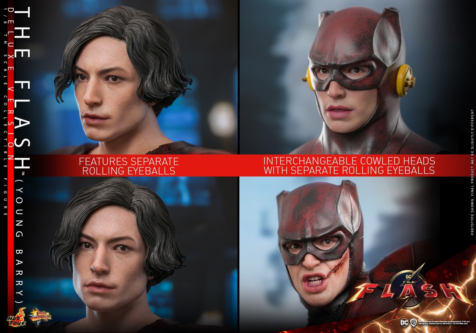 The highly accurate figure captured The Flash / Young Barry in sixth scale figure form features two newly developed cowled heads, one in standard form and one that depicts his battle damage look, with both heads coming with separate rolling eyeballs system. The figure comes with interchangeable lower faces for more expressions. His costume was recreated and painted to capture the details of his makeshift costume, down to the appearance of a sprayed logo on his chest and caution tapes around waist. The figure also includes a headset and a specially designed themed figure base with an LED light-up function.