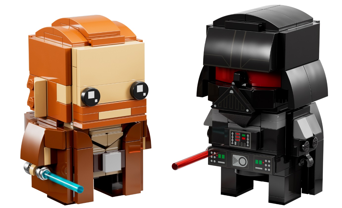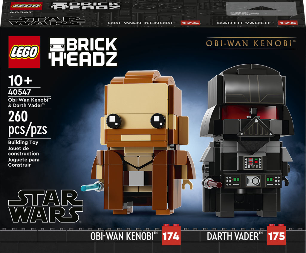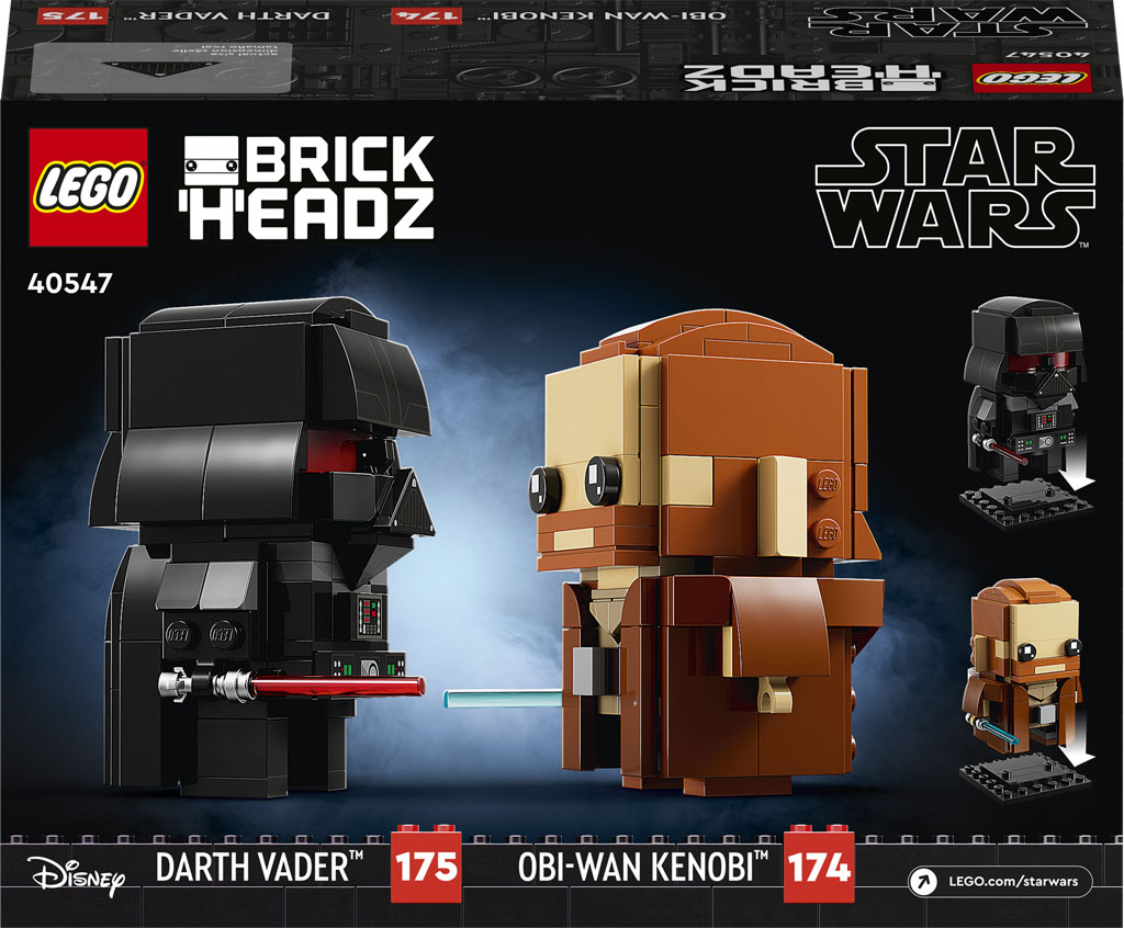 - Iconic Star Wars™ characters in LEGO® BrickHeadz™ style – Buildable LEGO BrickHeadz figures of Obi-Wan Kenobi and Darth Vader (40547) with lightsabers