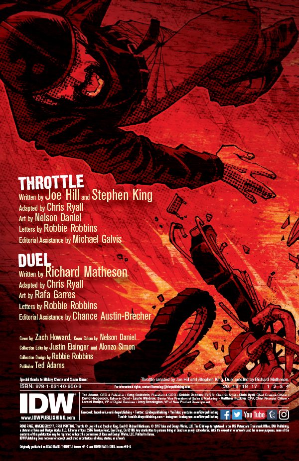 On the isolated road of the American highway… terror rides on 18 wheels! Tales of diesel fueled fear from the masters of horror fiction. With Throttle, acclaimed novelist/Eisner-winning graphic novelist Joe Hill collaborates with his father, Stephen King, for the first time on a tale that pays tribute to Richard Matheson’s classic short story, Duel. Now, IDW is proud to present comic book versions of both stories in Road Rage, adapted by Chris Ryall with art by Nelson Daniel and Rafa Garres.