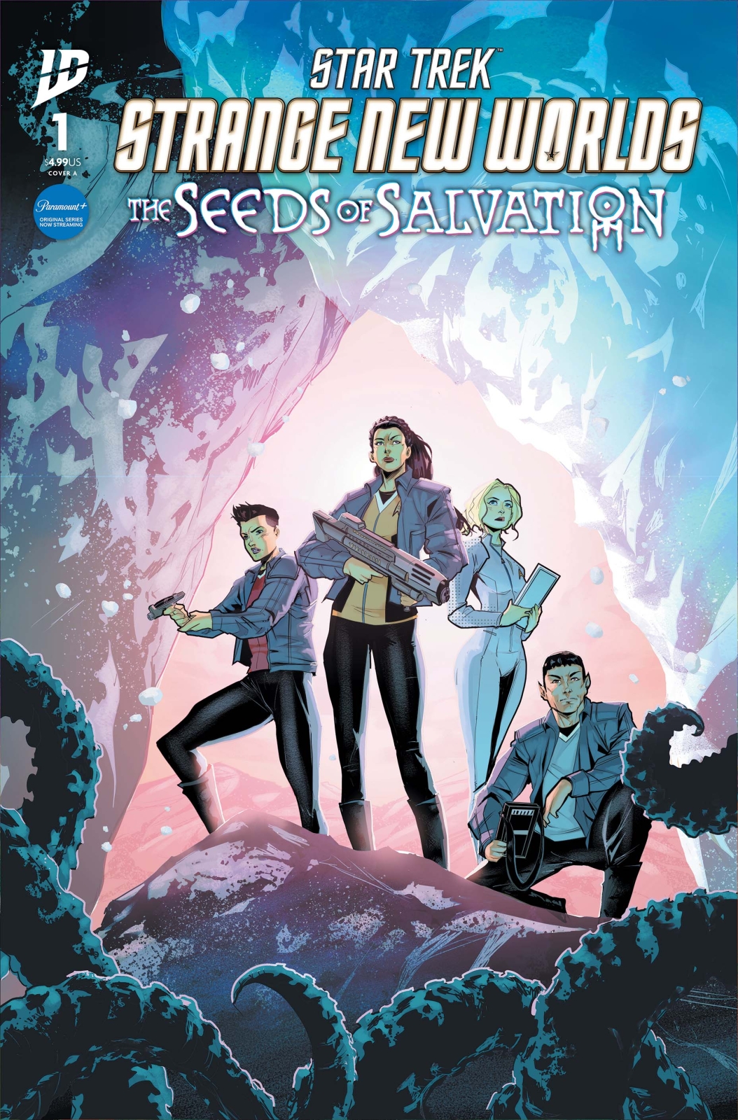 Landing in August is STAR TREK: STRANGE NEW WORLDS – THE SEEDS OF DESTRUCTION. Presented by Robbie Thompson – who is also writing on season four of Star Trek: Strange New Worlds – and incredible artist Travis Mercer, this five-issue limited series puts beloved characters Chapel, Una, La’An, and Spock – plus a new adorable robot sidekick named D6 – on a classic adventure with plenty of twists and turns as they explore an ice-covered planet and the scary secrets that lurk deep beneath the surface…