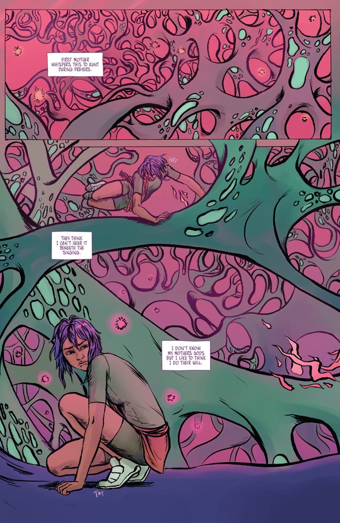“Prism Stalker is a story that I’ve carried close to my heart for a long time,” said Leong. “It’s changed over time, as I have, and has become something that’s given back to me, nurtured, surprised, and challenged me in different forms. In her 2014 National Book Award speech, Ursula Le Guin said: ‘I think hard times are coming when we will be wanting the voices of writers who can see alternatives to how we live now…’ This is what I love to read, and these are the kinds of comics I want to make: challenging the dominant paradigms and cultural hierarchies, letting differing visions of the future clash and play, creating endless potential, and threading the past into the present and future: a quantum indigenous futurism.”