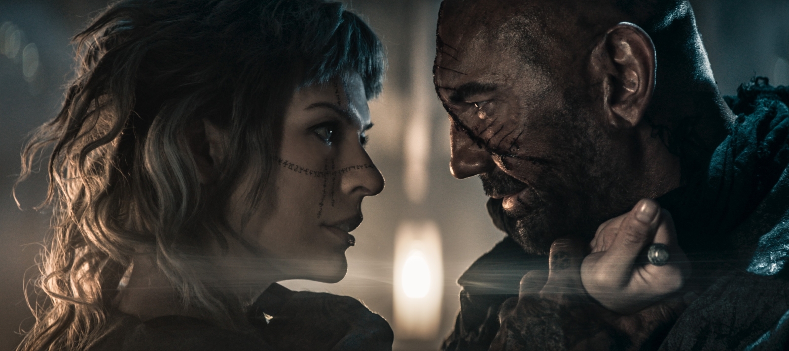 Naturally, the only place to find this werewolf is deep outside the sanctuary walls and into hazardous territory, where Boyce (Dave Bautista) comes in as a warrior guide while gradually delivering some clichéd, sad story exposition about his character. As the two seemingly get into an action sequence every few minutes, including right after Boyce visits what appears to be his former, only love, their trust for one another grows. As such, a third wish comes into the already seemingly impossible equation.
