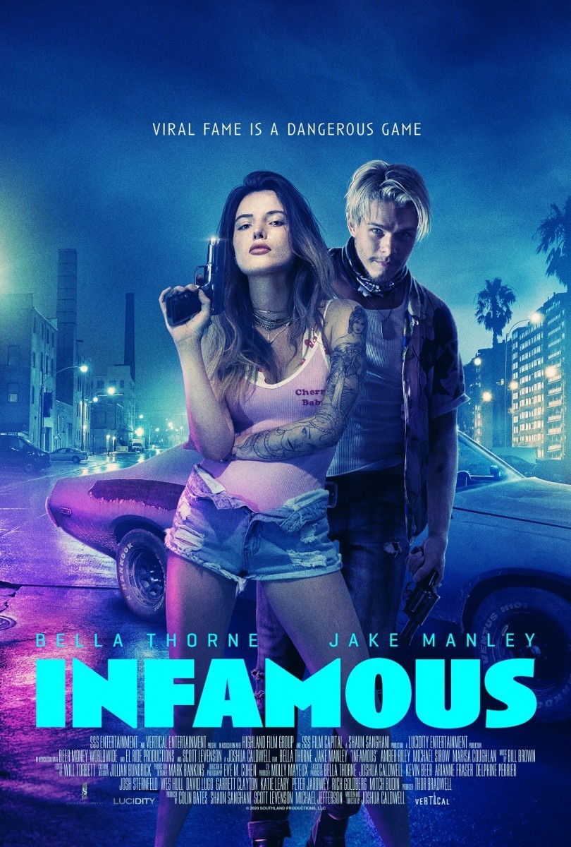 Vertical Entertainment has released a poster, images and trailer for writer-director Joshua Caldwell’s upcoming action thriller Infamous which stars Bella Thorne and Jake Manley as Arielle and Dean, a modern-day Bonnie & Clyde who live stream their robberies on social media to gain fame and followers; take a look here…