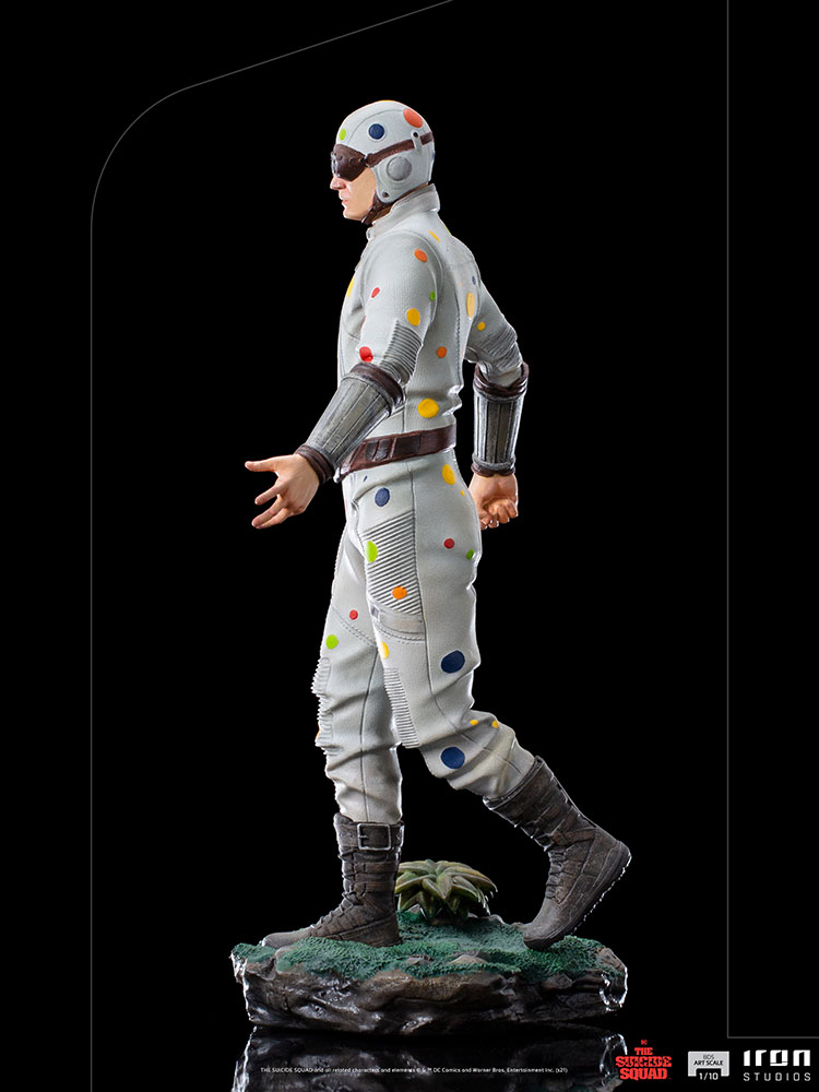 A member of the second strike team of the group Task Force X, better known as “The Suicide Squad,” is the peculiar figure wearing a white uniform with colored circles. He heads for a mission atop a base that resembles the forest terrain of Corto Maltese along with the rest of his newly-formed team. Despite being seen as a joke by his teammates, this shy and sad character possesses destructive and lethal power. Sideshow and Iron Studios add to the line derived from the movie The Suicide Squad this statue of the curious and iconic “Polka-Dot Man BDS Art Scale 1:10 Statue.”