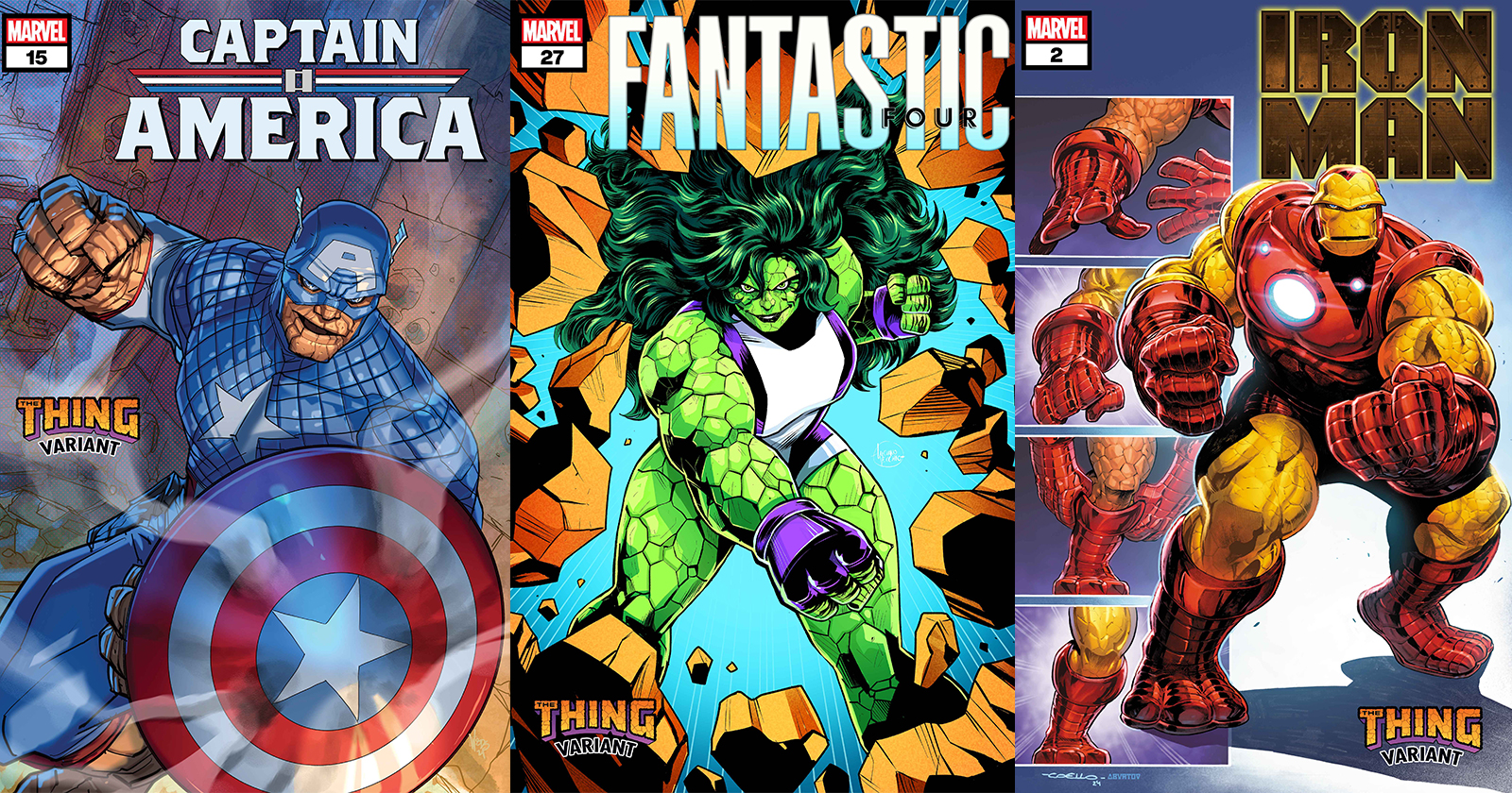 Things are getting rocky for Marvel’s superheroes this November as the spotlight falls upon Ben Grimm for the publisher’s latest variant cover program, which will see the likes of Captain America, Iron Man, Wolverine and more reimagined as the Fantastic Four’s Ever-Lovin’ Blue-Eyed Thing across twelve titles; get yourself a sneak peek at the covers here…