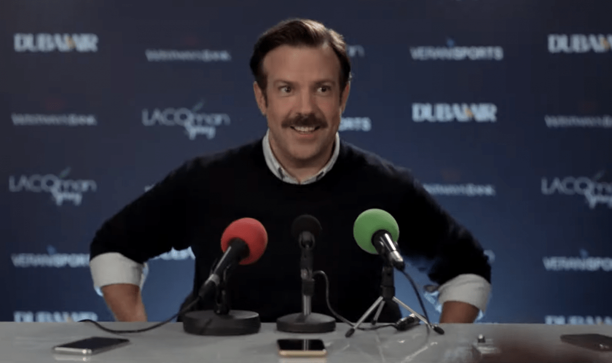 Jason Sudeikis plays Ted Lasso, a small-time college football coach from Kansas hired to coach a professional soccer team in England, despite having no experience coaching soccer.