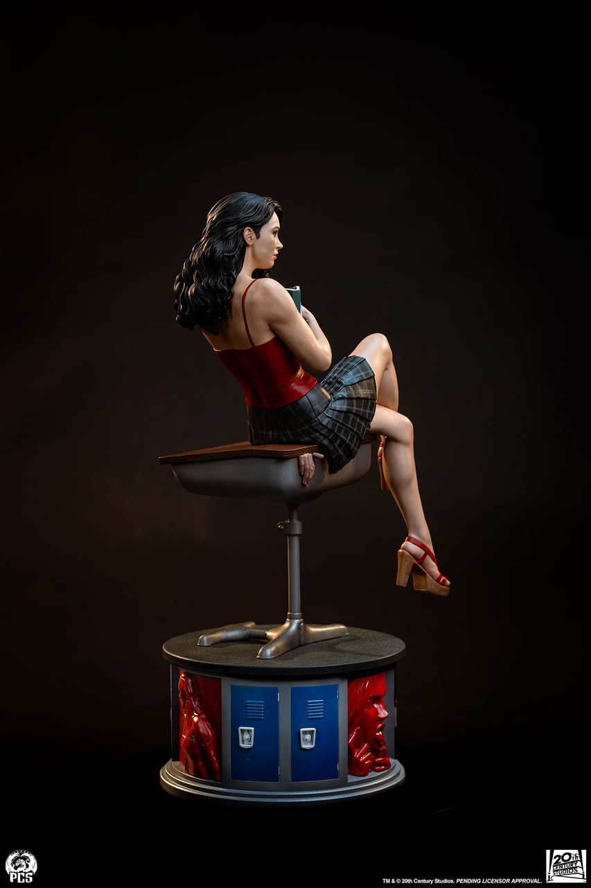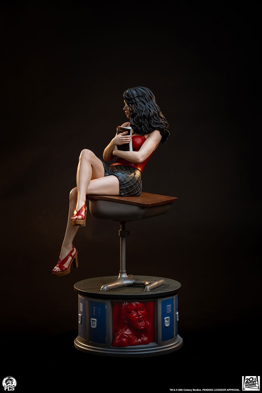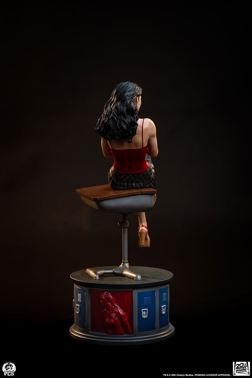 The Jennifer’s Body 1:4 Statue stands approximately 19” tall featuring the titular cheerleader sitting on her desk with her legs crossed and books clutched to her chest. The carefully sculpted and painted expression depicts Jennifer looking up with a sly expression suggesting the demonic secret she is hiding from her classmates.