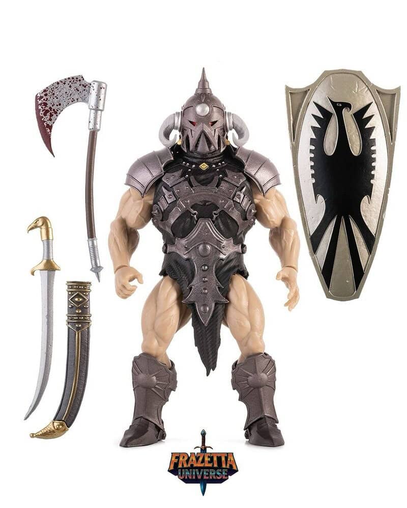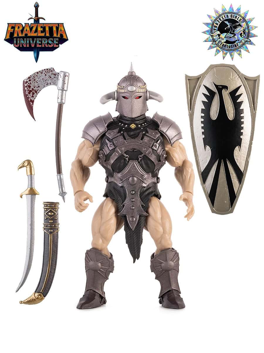 The FRAZETTA GIRLS Online Exclusive Death Dealer features an alternate helmet design exclusive to this release along with his signature weapons, removable armor, a removable illustrated cardback that slides out of the packaging for display, and a collectible trading card.
