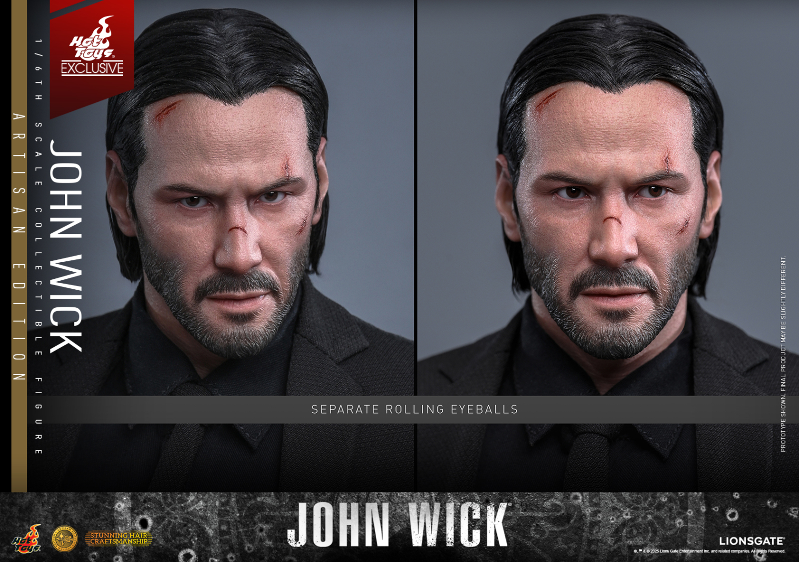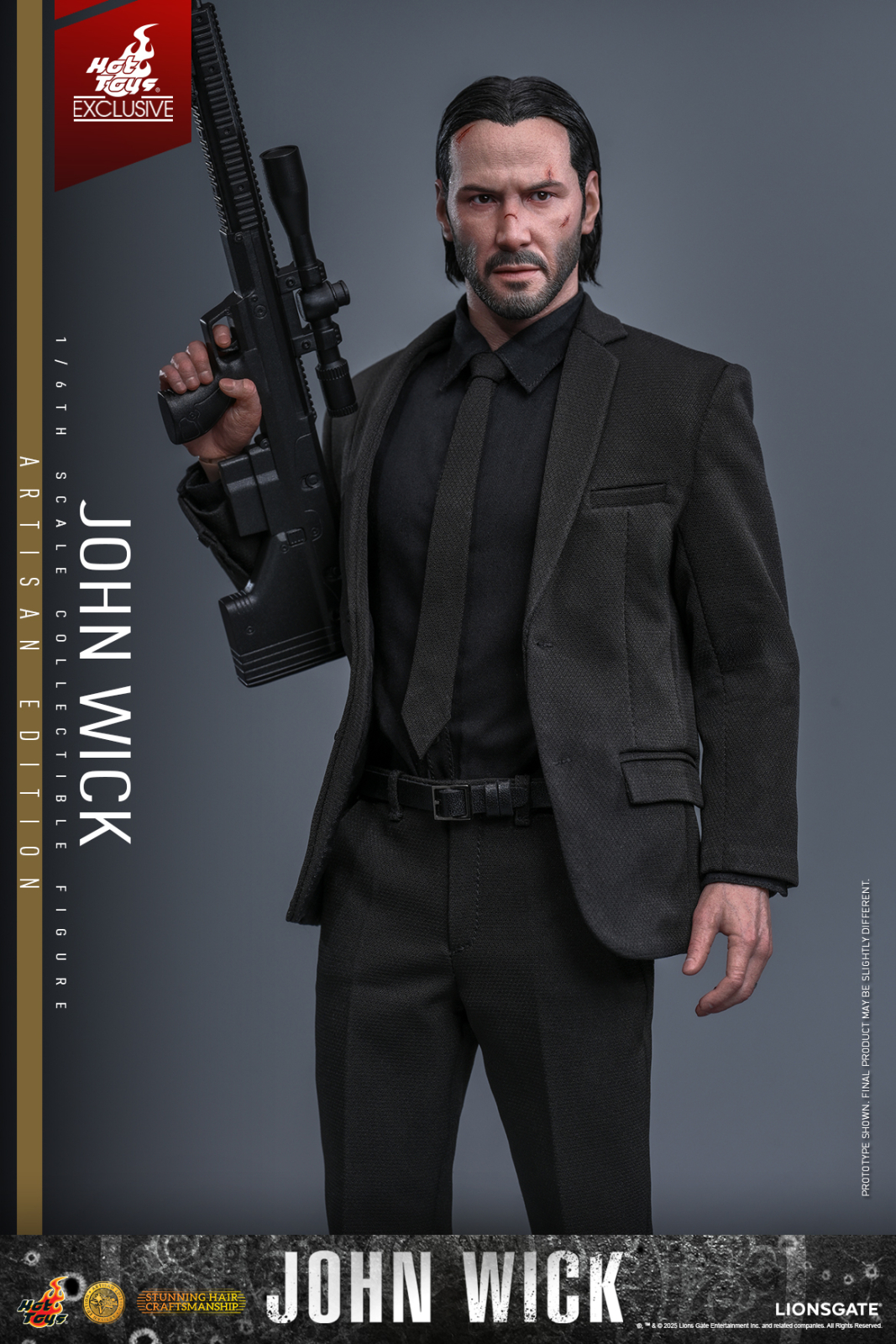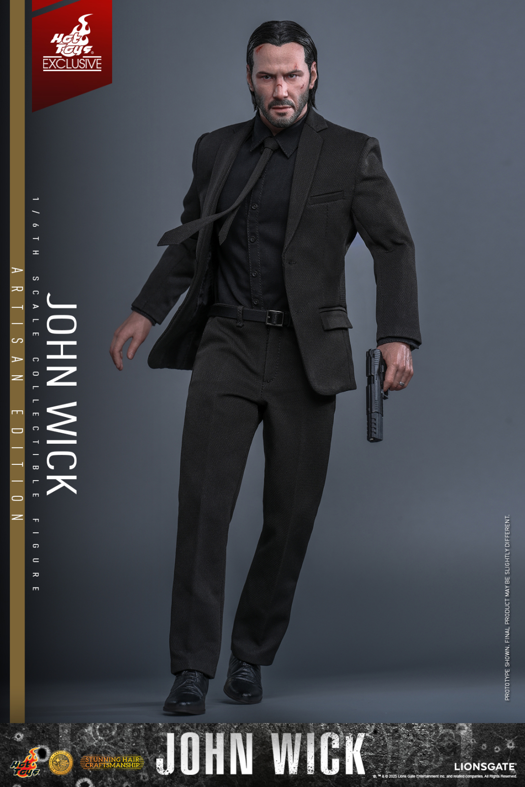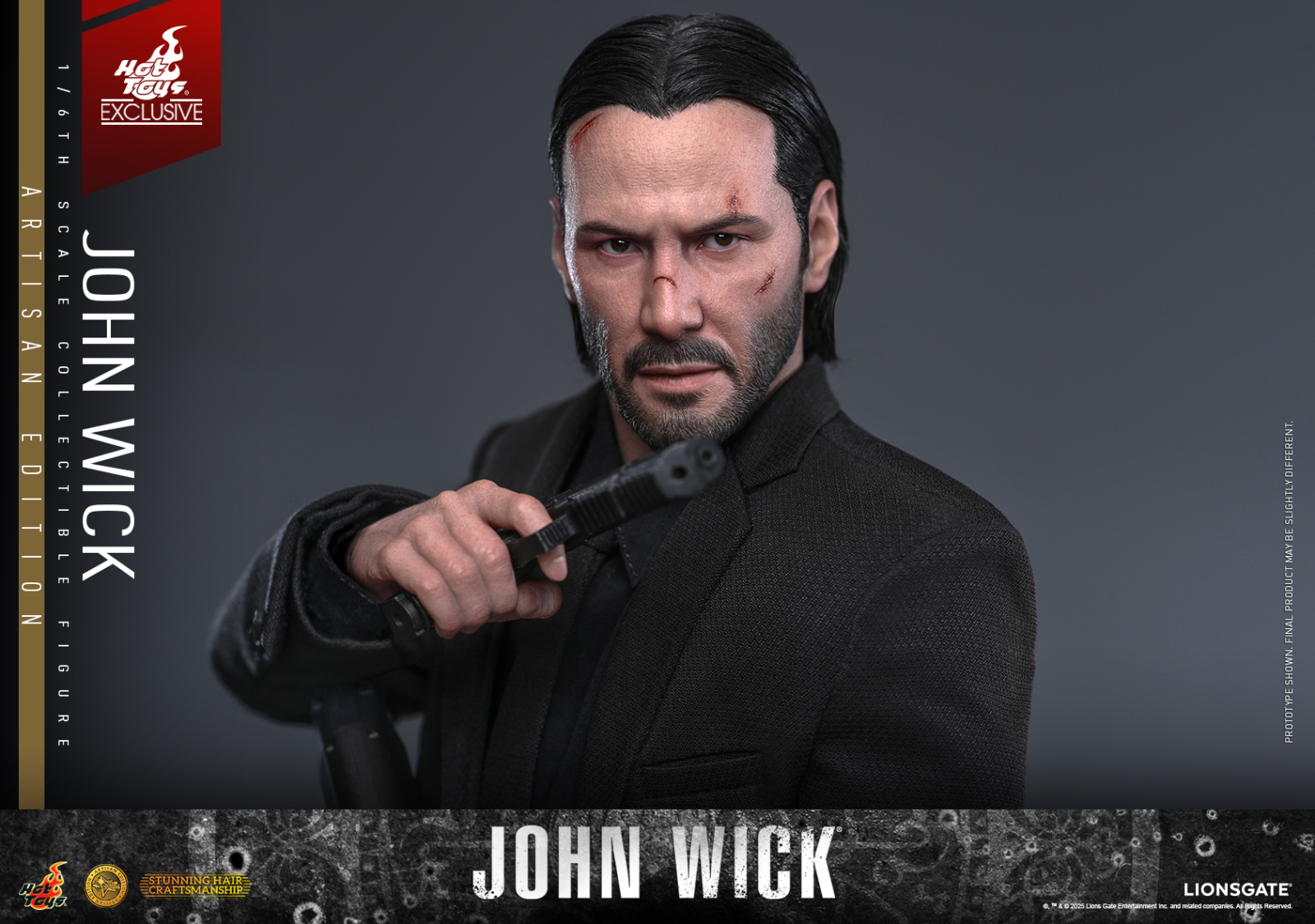 Hot Toys proudly presents the 1/6th scale John Wick Collectible Figure (Artisan Edition). The figure features a newly developed head sculpt with separate rolling eyeballs and battle-damaged paintwork. The Artisan Edition features a meticulously implanted mid-length slicked back hairstyle made of wool material, elevating the figures’ realism. The Artisan Edition is an exclusive release available with a limited quantity of 4,000 pieces only in selected markets.