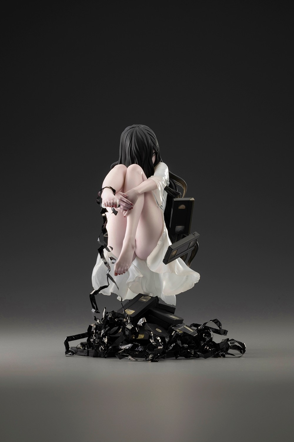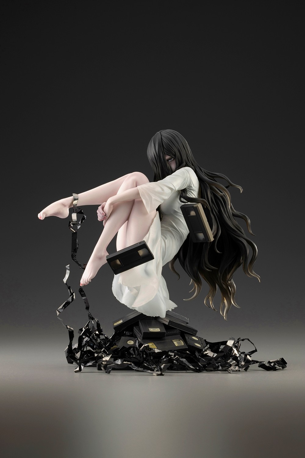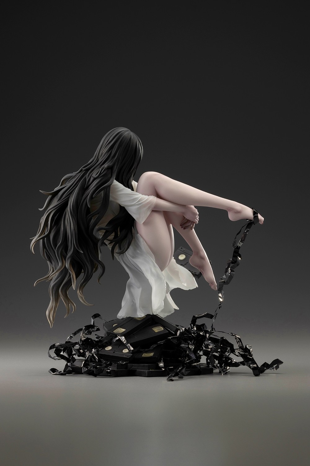 The design depicts a scene where Sadako seems to float using her strong psychic powers, hovering above a pile of videotapes. The immense amount of unraveled tape being pushed out of the cassettes can also be freely arranged around the statue. For extra decoration, two rolls of spare tape are included wrapped inside of a videotape-styled box so fans can use any amount they prefer to decorate this piece. To add to these features, something a little bit different from the rest is hidden among these videotapes. Add her to your horror collection today to find out what this piece holds!