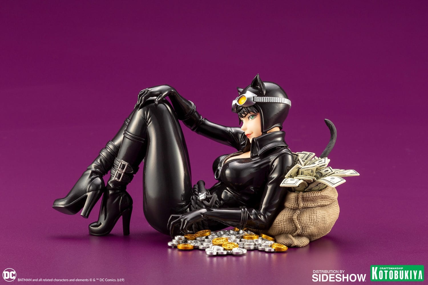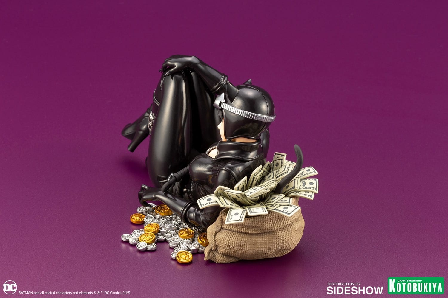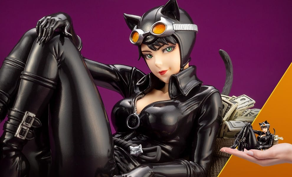 Batman’s fateful rival and love interest, Catwoman is making her return to the BISHOUJO series with brand new art by Shunya Yamashita! Catwoman rests against a burlap sack stuffed with cash, with a satisfied smile on her face that is sure to steal your heart! The Catwoman Returns statue is packed with exciting details that give the piece a unique sense of atmosphere, from Catwoman’s signature whip that playfully resembles a cat’s tail, to the actual kitten’s tail peeking out from Catwoman’s stash. The detail in the statue’s sculpting as well as the variety of texture and paint give this BISHOUJO a unique appearance that is sure to win its way into your heart and your collection!