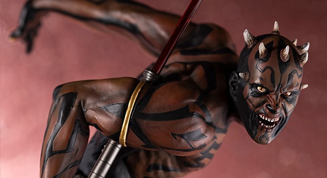 The statue features an all-new palette, which further enhances the Japanese arrangement of this piece. The subtle wash of color that resembles a traditional Japanese painting further enhances his strong character, providing an austere contrast between the refined elegance of the red shading and his striking tattoos, which serve as proof of his loyalty to the Sith Order.