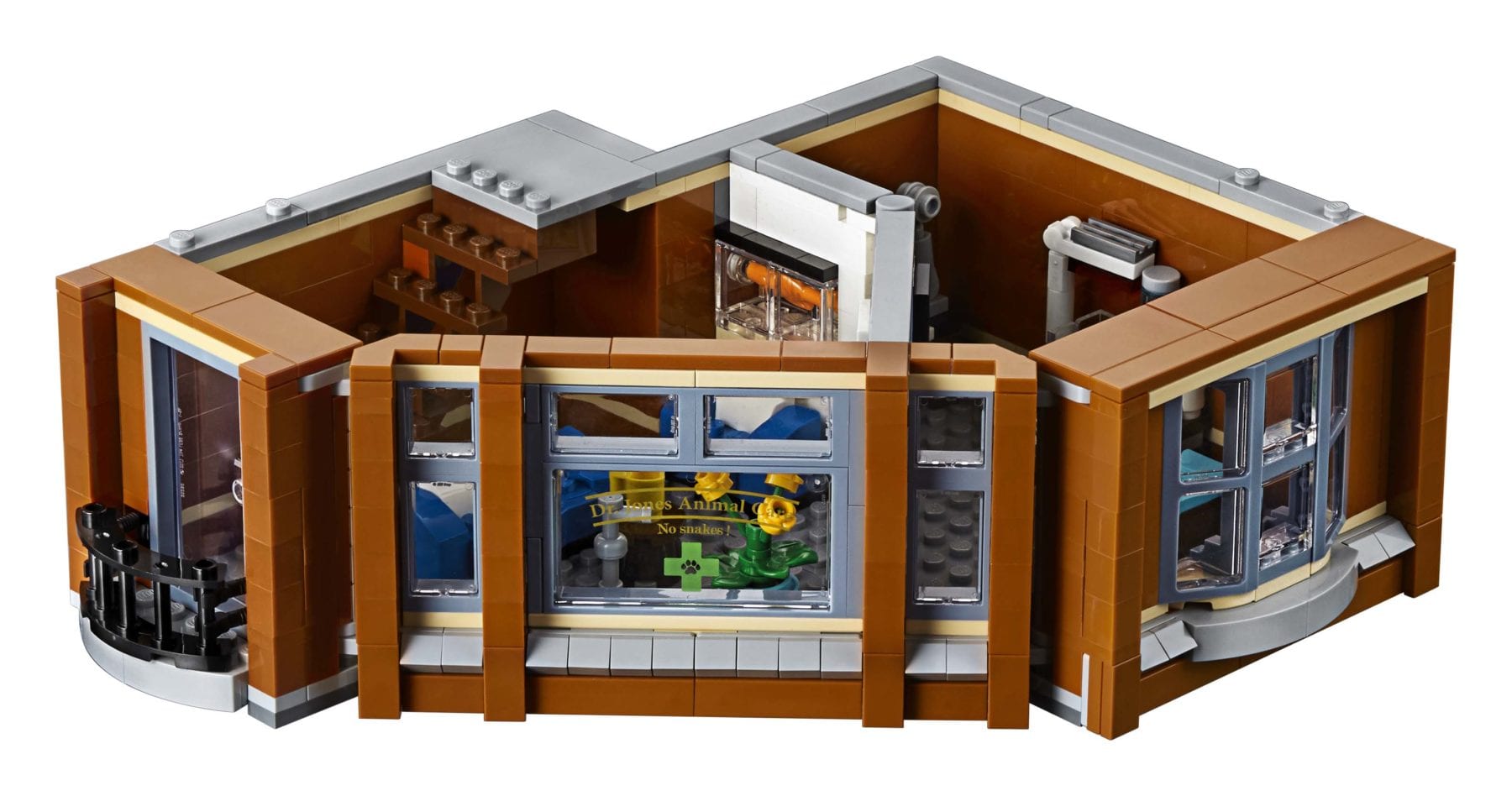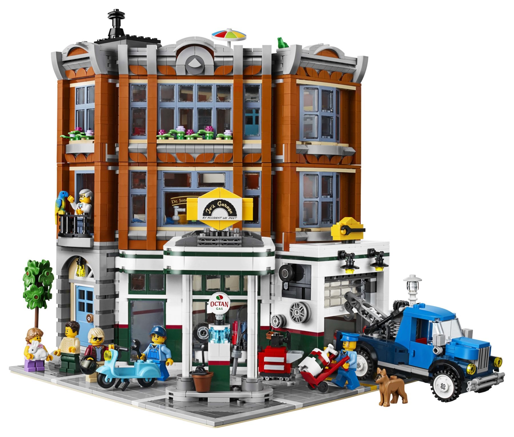 • Includes 6 minifigures: gas station owner, mechanic, vet, woman, man and a girl, plus bunny, parrot, dog, frog and fish figures.