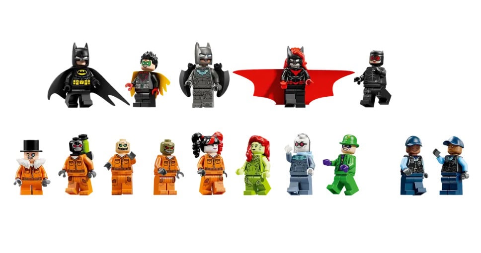 - LEGO® minifigures – Batman™, Batwoman™, Batwing™, Robin™, Mr. Freeze™, The Riddler™, Poison Ivy™, Catwoman™, Scarecrow™, Harley Quinn™, Bane™, The Joker™, The Penguin™, Killer Croc™ and 2 security guards