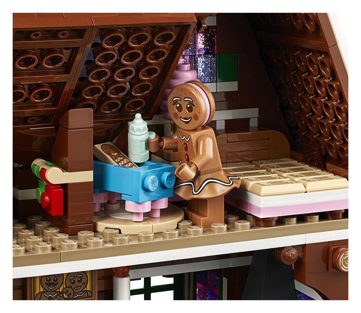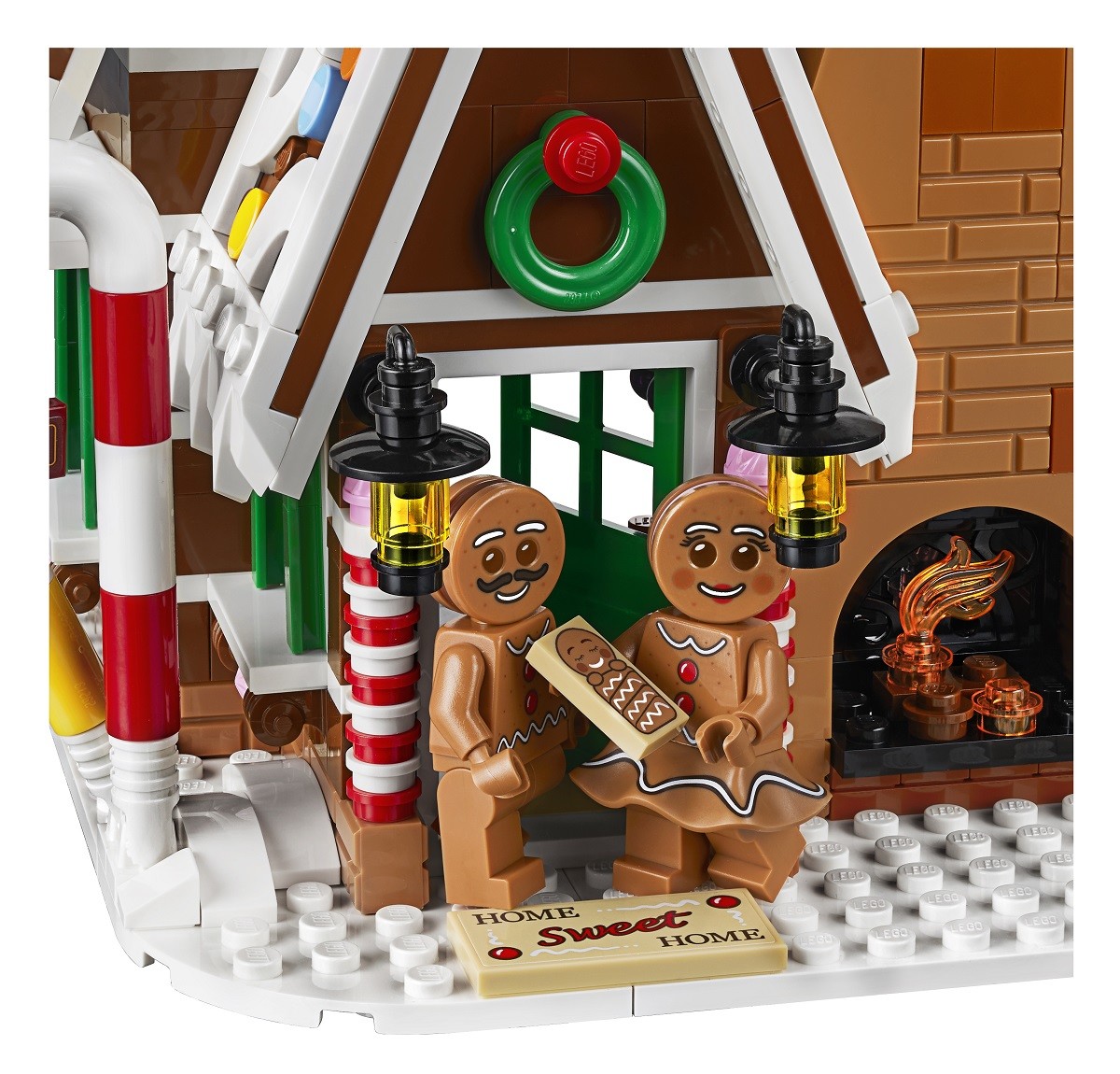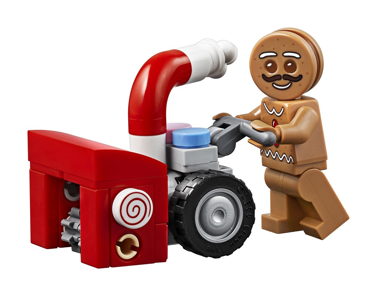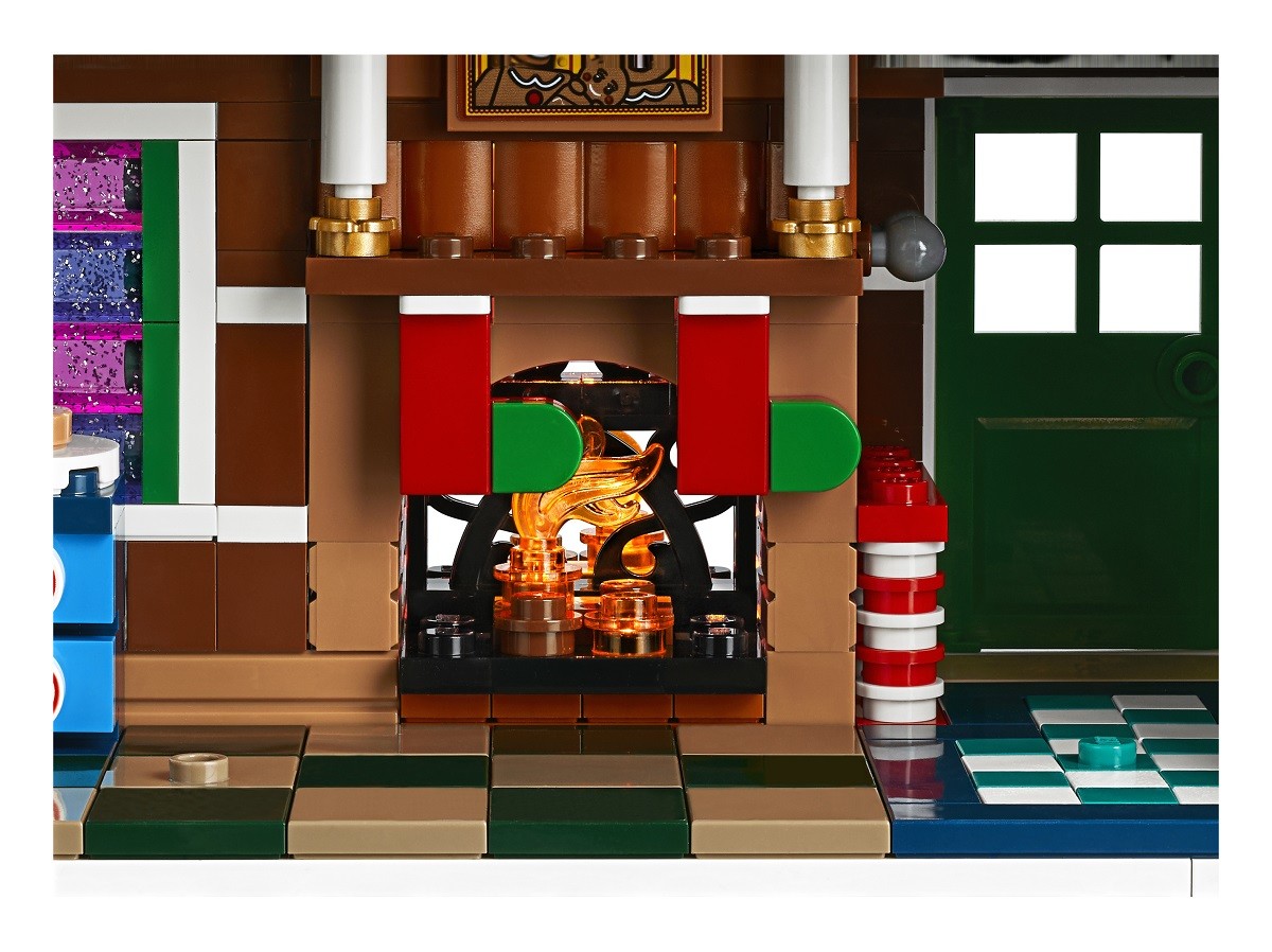 • The Gingerbread House features frosted roofs with colorful candy buttons, a rich facade with candy cane columns and walking sticks, glittery windows and a tall chimney stack with a glowing fireplace, plus a detailed interior, brick-built baby carriage and a snow blower.