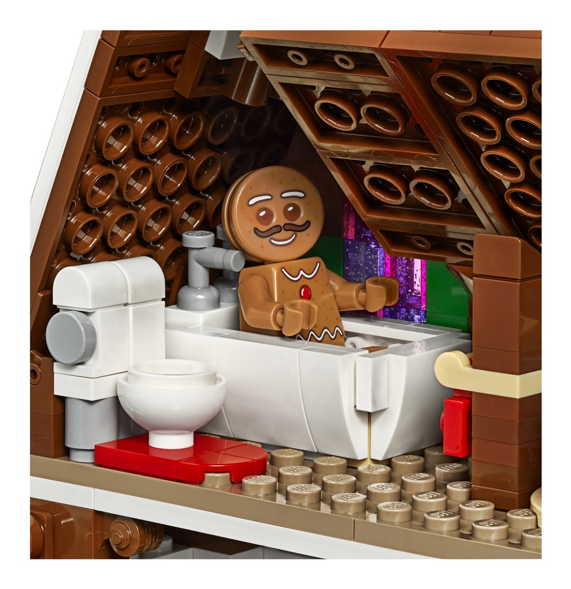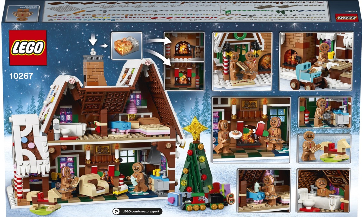 Enjoy a festive build and play experience with the LEGO® Creator Expert 10267 Gingerbread House. A treasure chest of magical details, this amazing model features frosted roofs with colorful candy buttons and a delicious facade with candy-cane columns, glittery windows and a tall chimney stack with a glowing fireplace. Inside the house there’s an array of fun details and candy furnishings including a tasteful bedroom with chocolate bed and cotton candy lamp, and a bathroom with the essential toilet and bathtub. This wonderful LEGO Gingerbread House sets the scene for imaginative adventures with the gingerbread family. Children can light up the cozy fireplace, help clear the sidewalk with the snow blower and nestle the gingerbread baby in its carriage. It also includes a decorated Christmas tree with wrapped gifts and toys, including a rocking horse and a toy train. This advanced LEGO set delivers a challenging and rewarding building experience and makes a great seasonal centerpiece for the home or office. Includes gingerbread man, woman and baby figures.