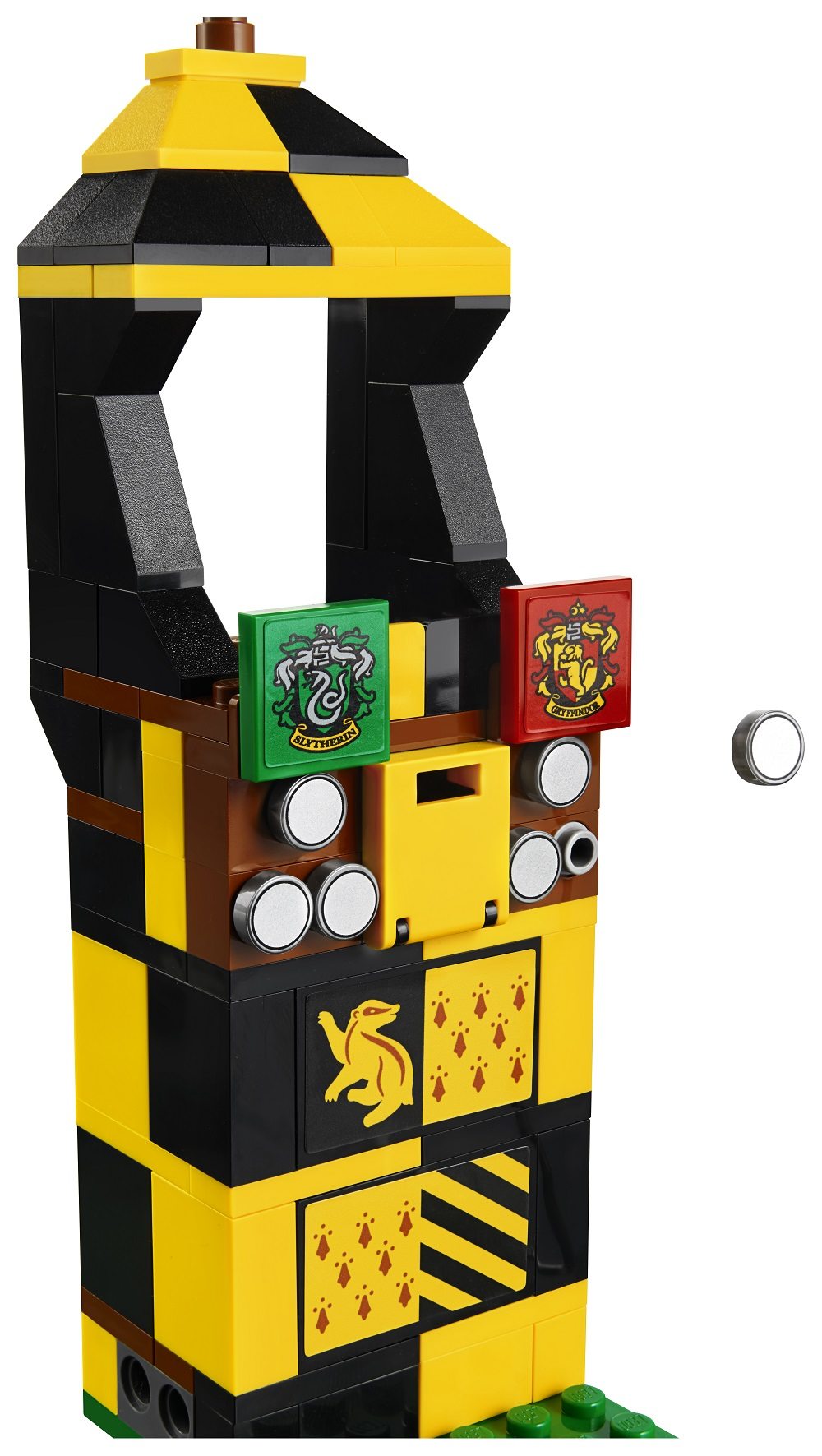 * Features Gryffindor™ house tower with an opening hatch, Slytherin™ house tower with a pop-up fire spell function, Ravenclaw™ house tower with a removable megaphone element, Hufflepuff™ house tower with scoreboard, and a base with 3 goalposts and rings, moving Keeper function and Bludger stud shooter.