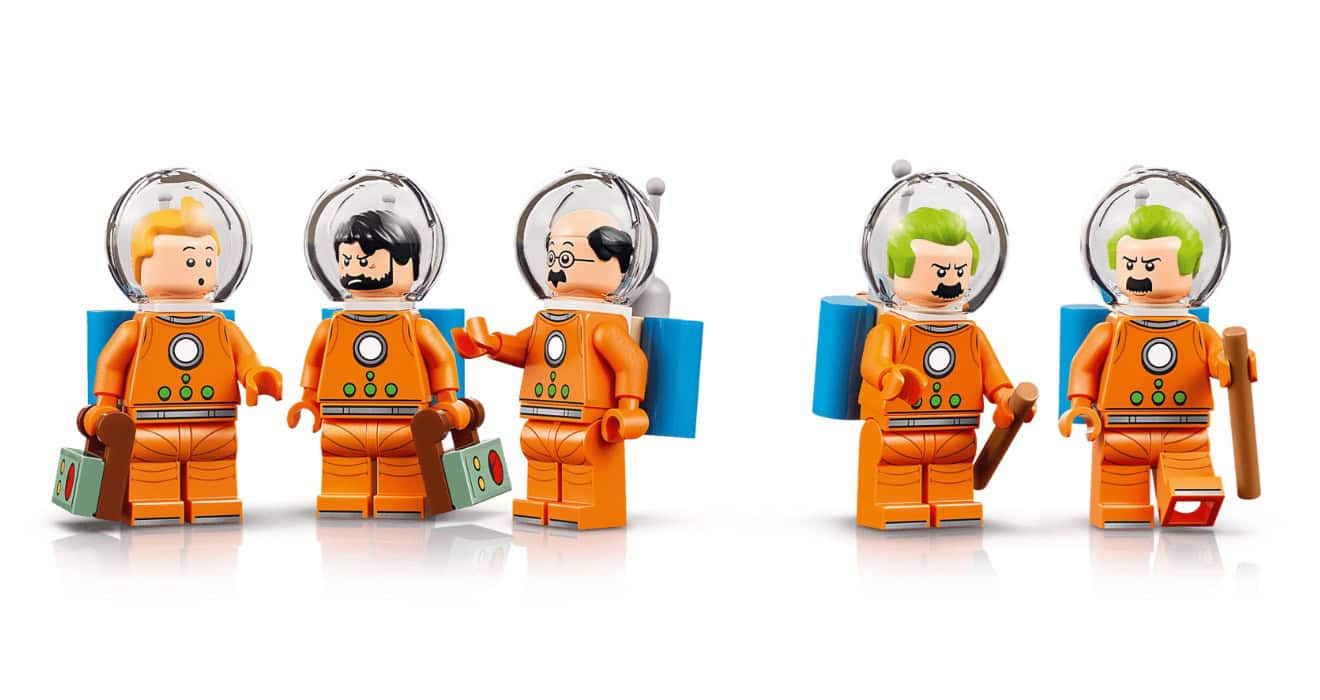 - 6 TINTIN® CHARACTERS – Tintin®, Captain Haddock®, Thomson and Thompson® and Professor Calculus® LEGO® minifigures, all in space suits with helmet and oxygen tank accessories, plus a Snowy® figure