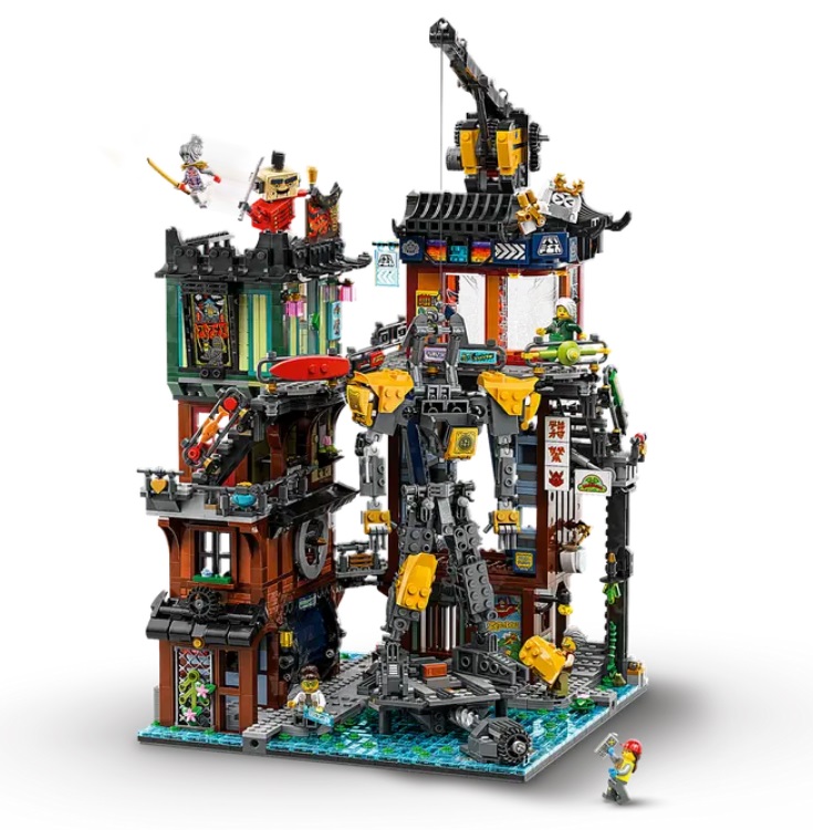 - Customizable mech toy – For the first time a NINJAGO® City model comes with a posable mech toy kids can customize with armor and stickers before displaying on a platform