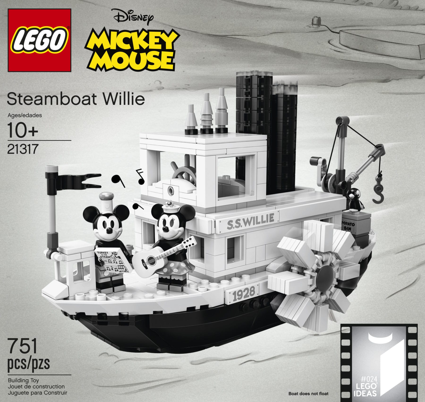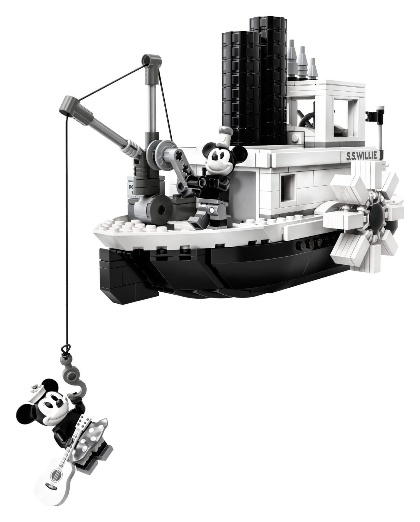 Disney Mickey Mouse fans will love this LEGO® Ideas 21317 Steamboat Willie building toy marking the 90th anniversary of the most famous cartoon character ever. Mickey Mouse made his screen debut in a 1928 black-and-white animated short film called ‘Steamboat Willie’, which was also the first Disney film to have synchronized sound. This LEGO brick version of the S.S. Willie features steam pipes that move up and down and paddle wheels that rotate when the boat is pushed along. The boat’s bridge has room for a minifigure and play-inspiring nautical details such as the ship’s wheel, life buoy and buildable bell. On deck there is a working crane to lift the ‘potato bin’ cargo aboard and this unique toy building set comes with new-for-April-2019 Mickey Mouse and Minnie Mouse minifigures, each with special silver-colored decoration, plus a parrot figure. An ideal LEGO set for kids and adults to recreate scenes from the original Mickey Mouse cartoon or simply build and display this striking monochrome model.