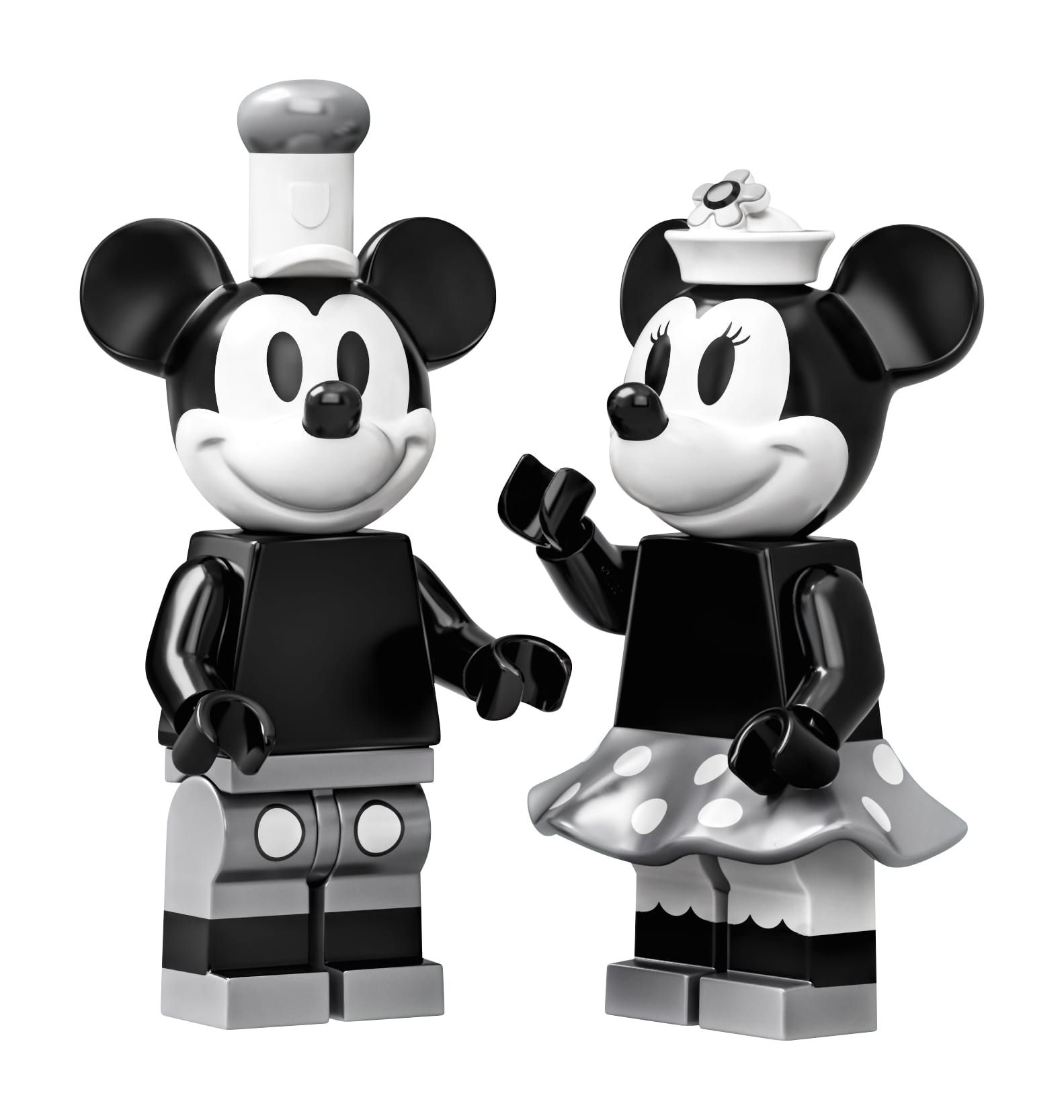 • This unique toy building set includes 2 new-for-April-2019 minifigures: Mickey Mouse and Minnie Mouse, each with silver-colored decoration, plus Mickey Mouse’s parrot figure.