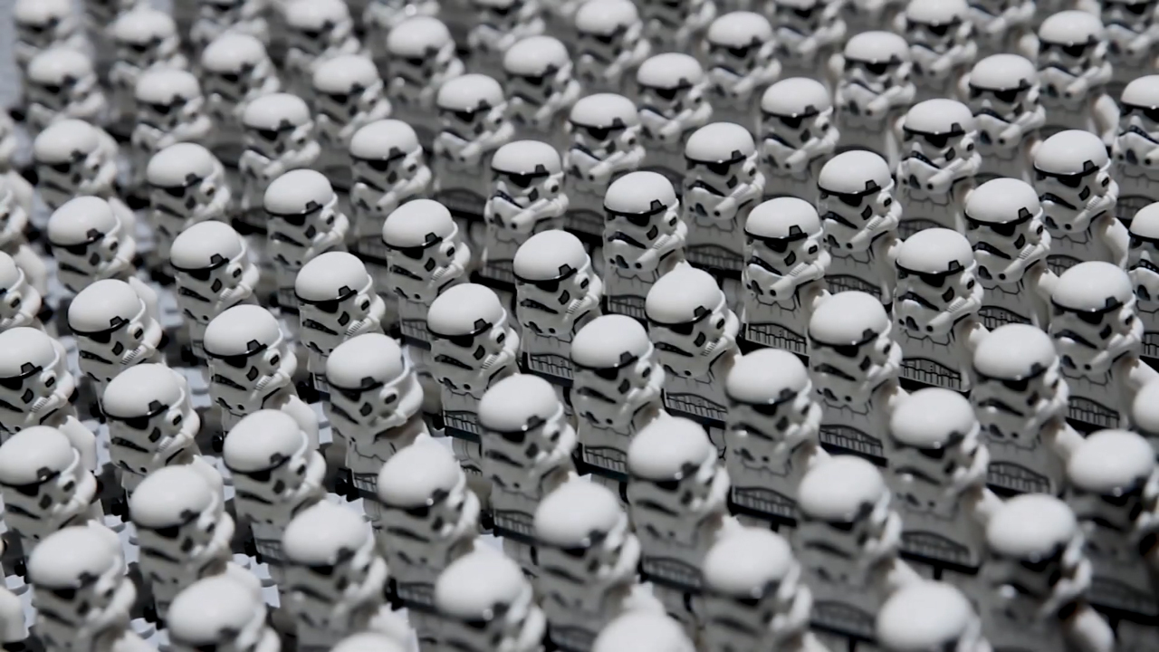Composed of 36,440 LEGO Stormtrooper minifigures and assembled in the shape of the iconic stormtrooper helmet, the 20 feet tall by 20 feet wide model took 12 people 38 hours to create and install. The LEGO Stormtrooper minifigures used in the model are the same ones currently available in the 20th anniversary commemorative building set, the LEGO Star Wars Imperial Dropship