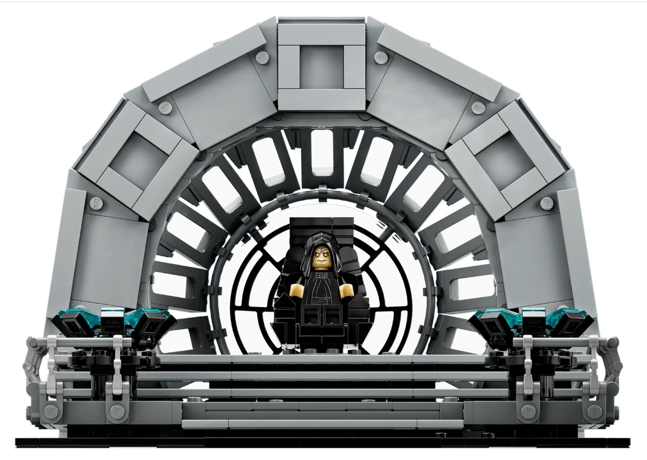 - Authentic details – A circular Death Star window element, rotating throne, 2 display consoles and more. The set also features a plaque marking the 40th anniversary of Star Wars: Return of the Jedi