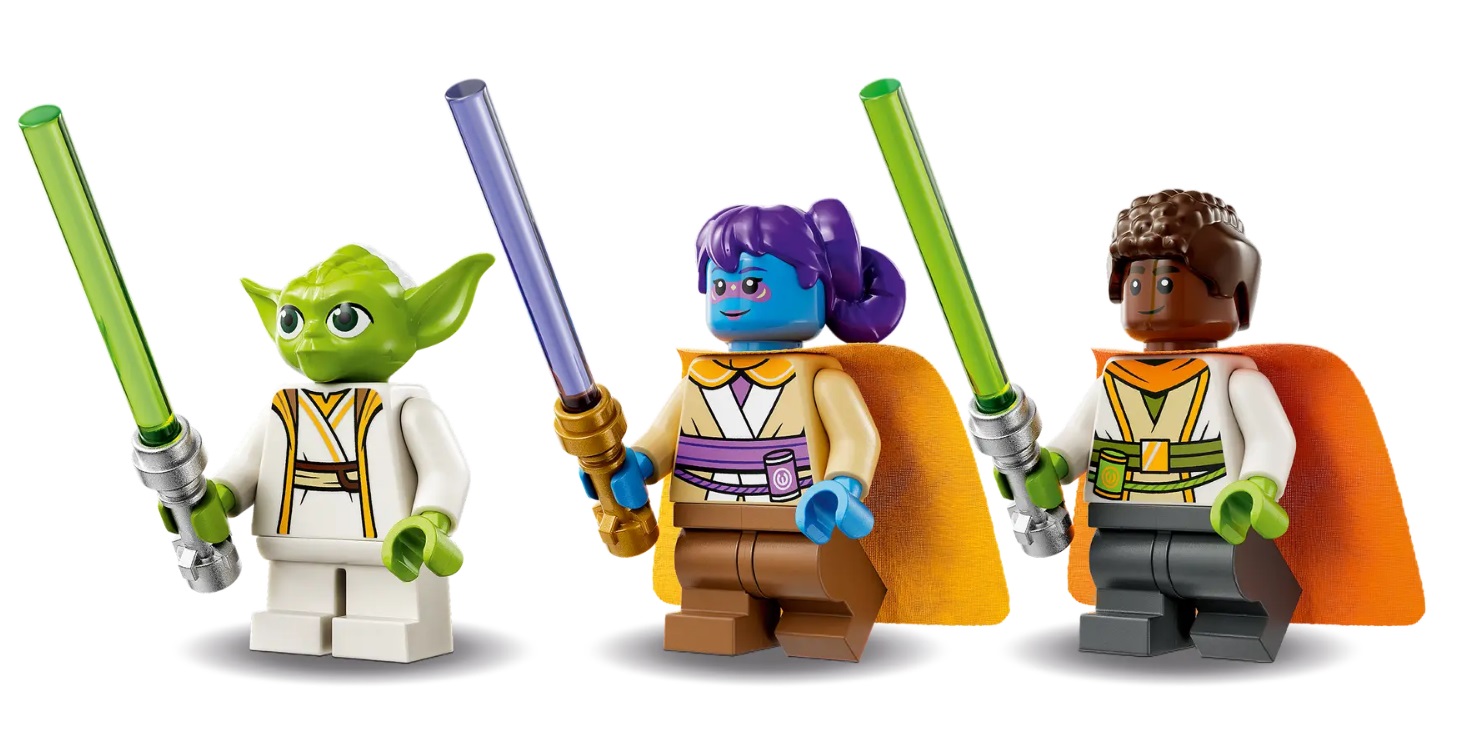 - 3 LEGO® Star Wars™ minifigures – Lys Solay and Kai Brightstar with mid-size legs and Master Yoda with small legs. Each character has a lightsaber for Jedi training