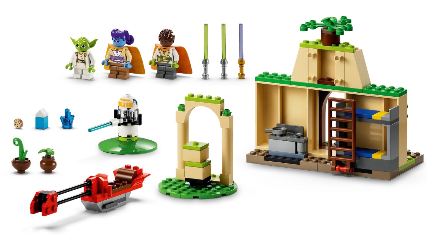 - Tenoo Jedi Temple – Features a ‘levitating’ rock function, a kitchen with a buildable blue milk carton, bunk beds with a hinged ladder, 2 clips for lightsabers and a crystal element