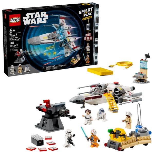 Launch into a thrilling new galaxy of LEGO® Star Wars™ adventures with Luke’s Red Five X-Wing interactive building toy (75423) for kids. Part of a range of sets powered by the LEGO SMART Play™ system, this All-In-One Set includes all SMART Play components – a SMART Brick and charger, 2 LEGO SMART minifigures and 5 SMART Tags – enabling responsive play, dynamic sound and lights and more. Hear the engine’s roar as the X-wing fighter is flown. Activate laser-shooting sounds with the X-wing and Imperial turret. Monitor communications in the command center. Bring SMART Luke Skywalker and SMART Princess Leia to life. Refuel and repair the X-wing with the transporter. Help children get started, troubleshoot, control sound levels and download updates for enhanced SMART Play action with the LEGO SMART Assist App. A top Star Wars gift for kids, boys and girls ages 6 and up, this innovative set contains 581 pieces.