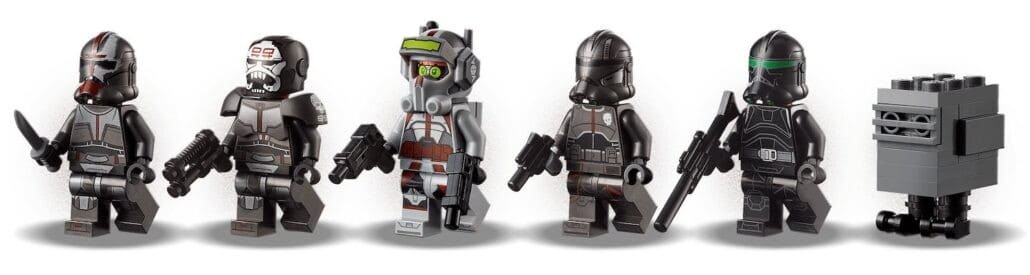 - Includes 5 new-for-August-2021 LEGO® minifigures of Bad Batch clones Tech, Echo, Hunter, Wrecker and Crosshair with assorted weapons and Tech’s buildable backpack, plus a Gonk Droid LEGO figure.