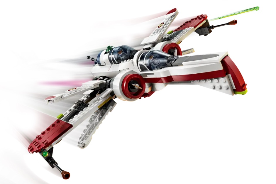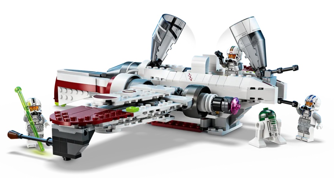 The buildable starship playset includes 4 LEGO Star Wars characters. The Clone Pilot Odd Ball, Clone Pilot Jag and Clone Pilot LEGO minifigures can be placed in the cockpits, and there is also space on board for the R4-P44 LEGO droid figure.