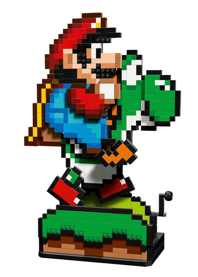 • Pixelated Nintendo® figures – Turn the handle at the base of the model to make Yoshi run with Mario on his back, and turn the dial behind Yoshi’s head to make his tongue pop in and out
