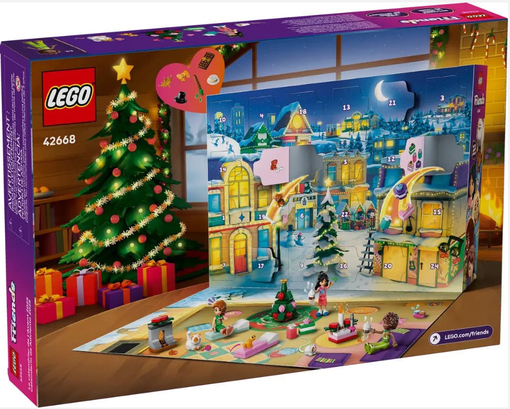 Inspire holiday cheer and cozy moments for girls and boys aged 6 and up as kids open the doors of the LEGO® Friends Advent Calendar 2025 (42668) toy building set. It comes with 5 minidolls, including Aliya, Autumn, Liann, Nova and Leo, plus 5 LEGOanimals including 2 dogs, a guinea pig, a gecko and a cat figure. Open a door each day to build the holiday sleepover story. Find surprises behind each door with sweet Christmas builds to make. Discover festive activities, like writing to Santa, decora ting the tree, singing karaoke, riding the hobbyhorse and making hot chocolate. Each minidoll comes with a mattress and each pet has accessories so kids can create different stories as they assemble the scene. Other fun accessories include a sofa,lamp, fireplace, sled, 5 gift boxes and a LEGO-piece reindeer plushie. As well as being a holiday countdown gift for kids, this creative toy supports young builders’ social skills as they join the friends for an unforgettable sleepover.