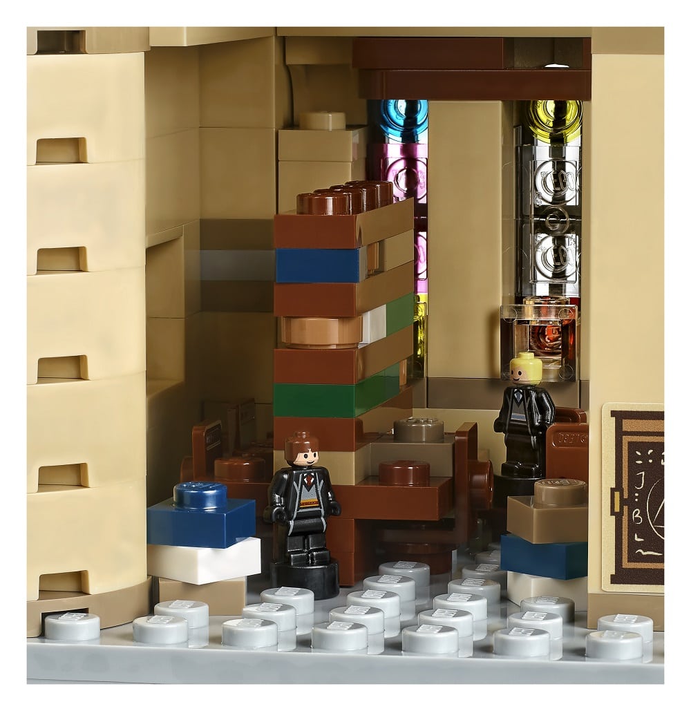 • Hogwarts™ Castle features the Great Hall with buildable ‘stained glass windows’, house banners, benches, tables, flaming torches and moving staircases; potions classroom with racks of jar elements; Defense Against the Dark Arts classroom with assorted potion jars, gramophone and a closet containing a boggart; Chessboard Chamber with chess piece elements; Room of Requirement with assorted elements, including the Goblet of Fire and the vanishing cabinet; Chamber of Secrets™ with the Basilisk and Tom Riddle’s Diary; hidden Devils Snare room with vine elements; Gryffindor™ common room with fireplace and seating; Professor Dolores Umbridge’s office with desk, chair and pink furnishings; library with bookcase and desks; and Professor Dumbledore’s office with the Griffin statue entrance and Memory cabinet.