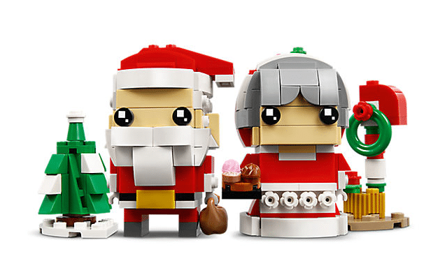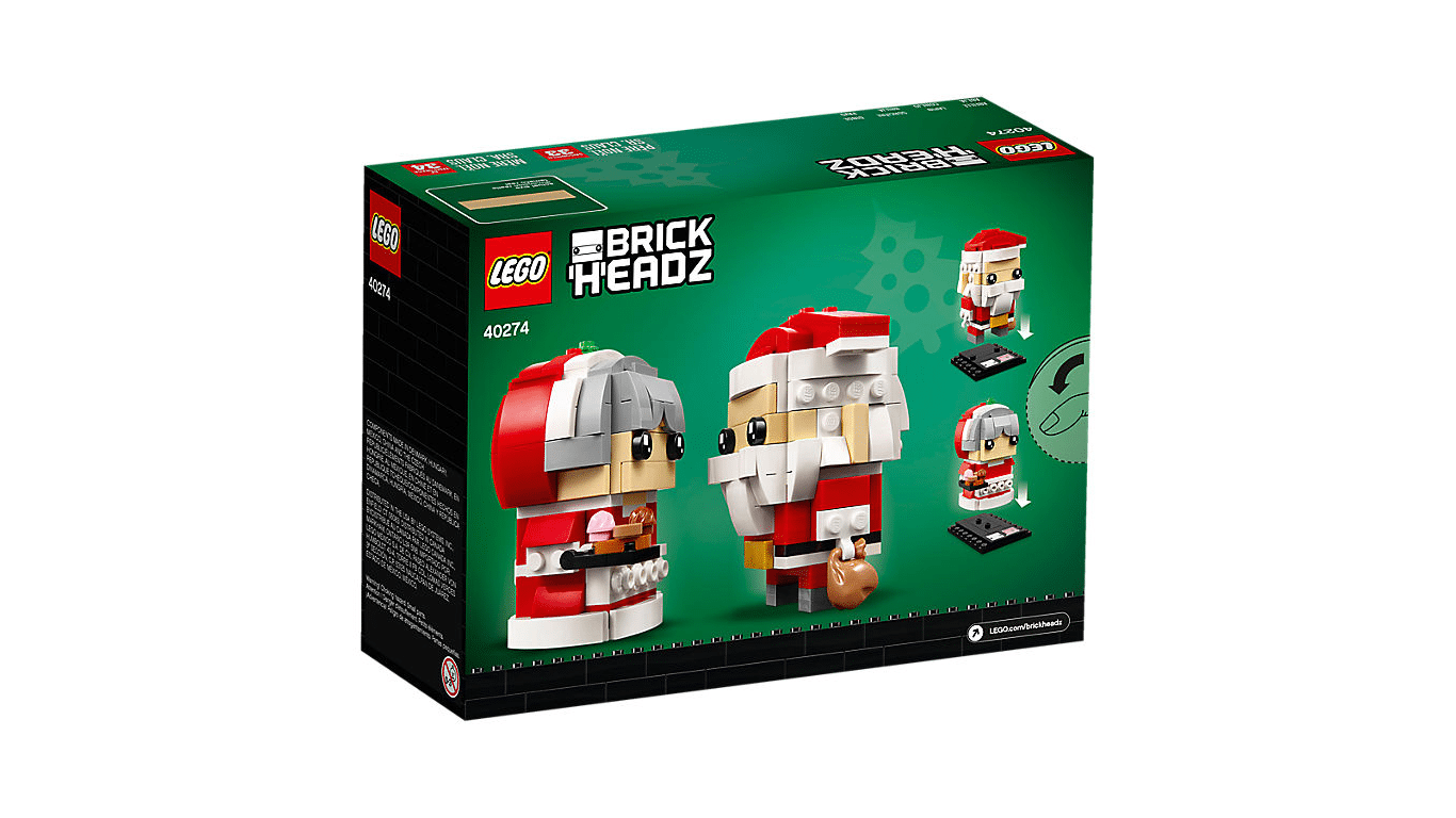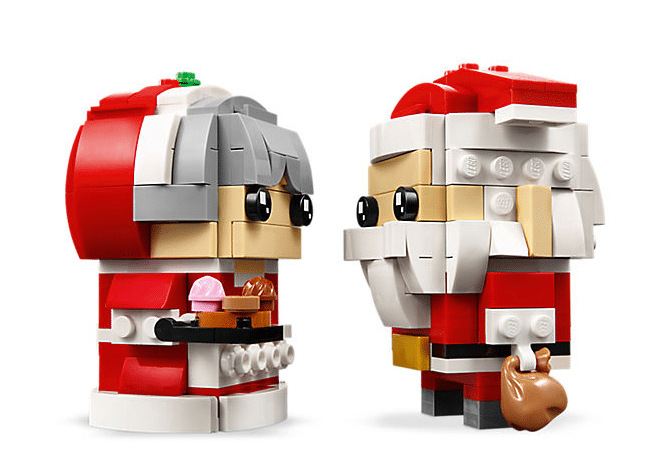 Buildable LEGO® BrickHeadz™ Mr. & Mrs. Claus construction characters feature decorated eyes, festive red and white outfits, detachable gift sack and assorted cake and cookie elements.