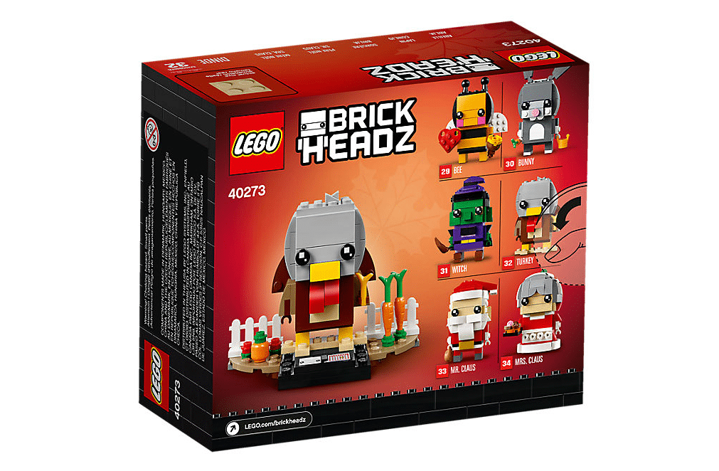 Give thanks and prepare for fun celebrations with this cute LEGO® BrickHeadz™ 40273 Thanksgiving Turkey. Check out its yellow beak, brown wings and detachable carrot, plus buildable garden scene with white picket fences, carrots and a pumpkin. This fun construction character also comes with a buildable collector’s baseplate with a seasonal calendar and BrickHeadz logo for easy display in the home, office or anywhere you like.